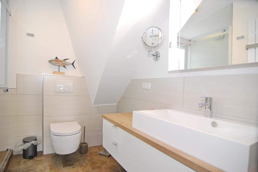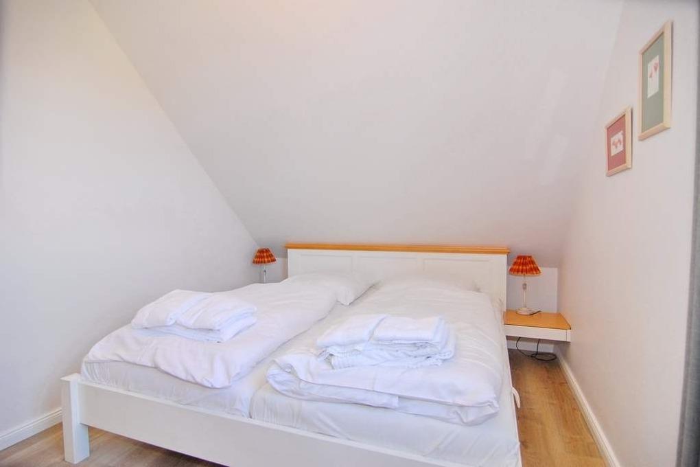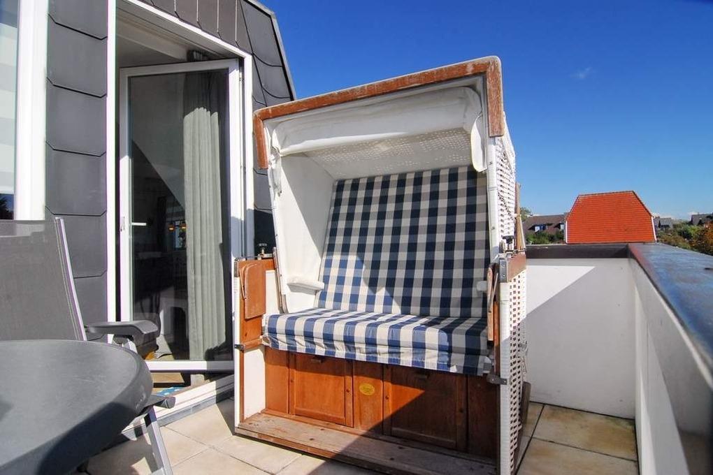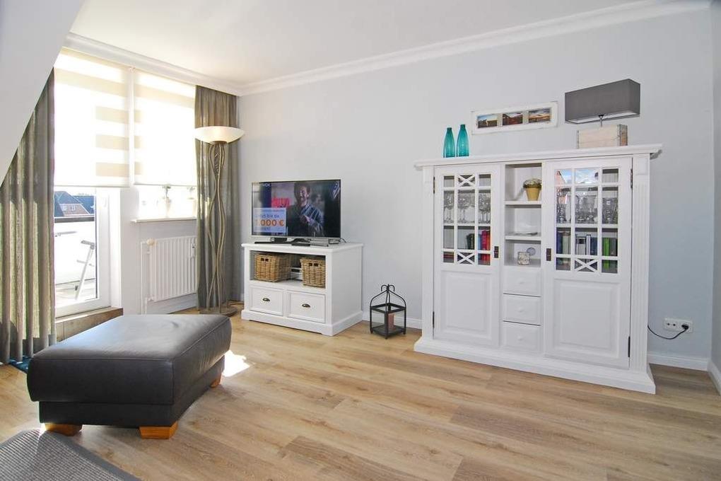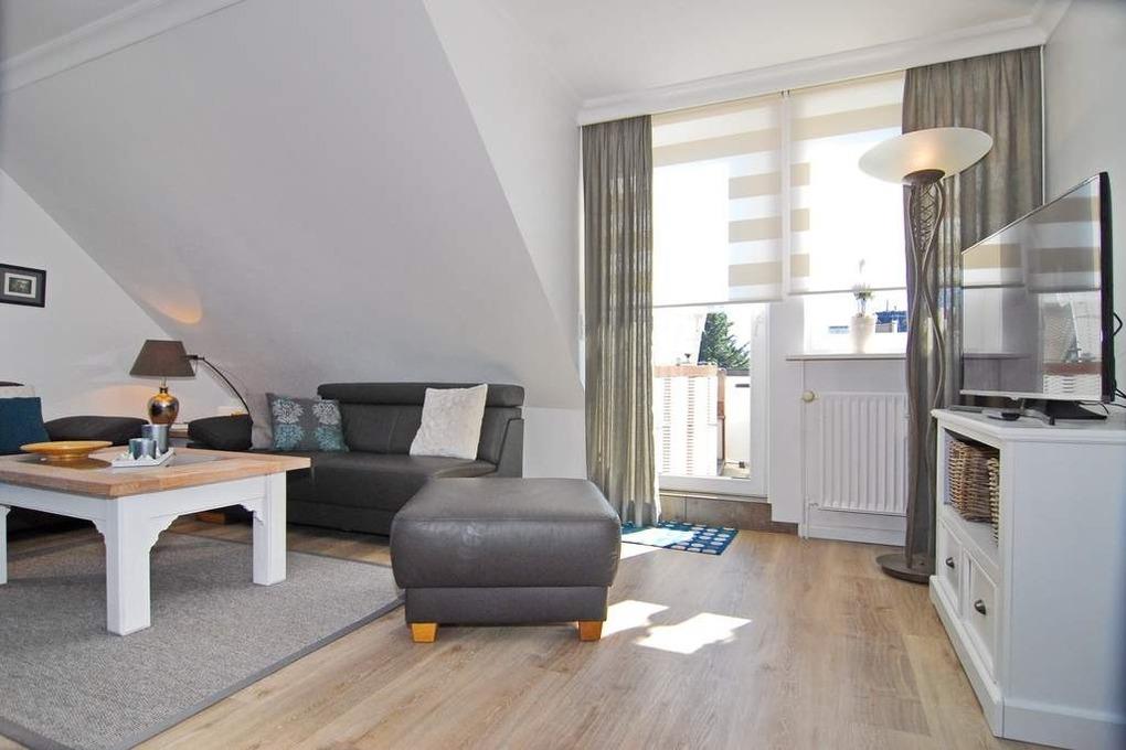 Moderne 3-Zimmer-Maisonette-Ferienwohnung, ca. 85 m². Nichtraucher-Whg.! OG: Wohnzimmer mit Flat-TV sowie Stereoanlage und Internet (ohne Gewähr), Leder-Couchecke mit Sessel, heller Essplatz am Fenster, offene Küche mit Backofen, Geschirrspüler und Mikrowelle, Zugang zum Südbalkon mit Strandkorb und Balkonmöbeln, Schlafzimmer mit Doppelbett und Kleiderschrank, Duschbad mit Regendusche / WC. Wendeltreppe zum geschlossenem Dachgeschoß mit 2 Einzelbetten sowie 2 Sessel mit Tisch, Einbauschrank und Flat-TV. Das Appartement ist mit Designer-Fußboden ausgelegt. Tierhaltung ist nicht gestattet. Der PKW-Stellplatz Nr. 2 ist am Haus ( ist der 3. von links ). Bettwäsche und Handtücher sind zur Anreise aufgezogen.