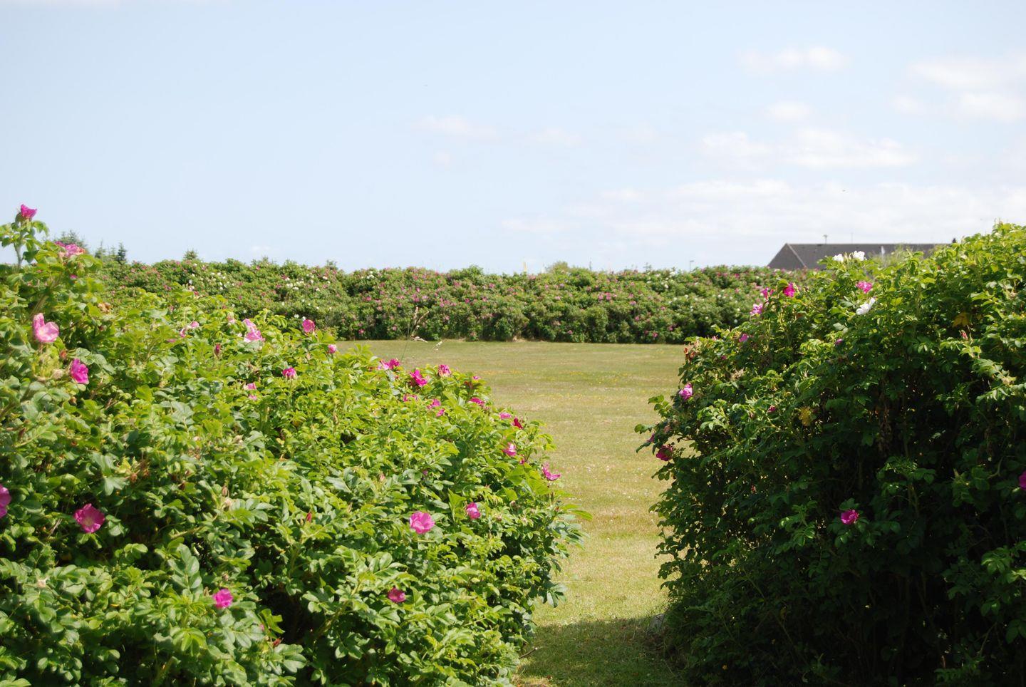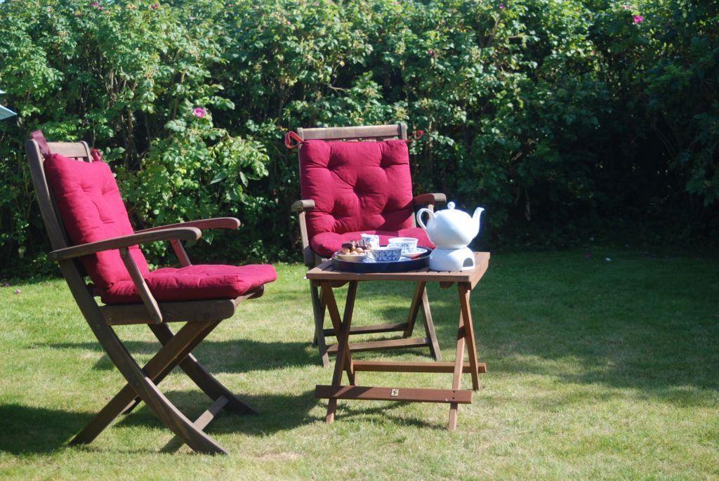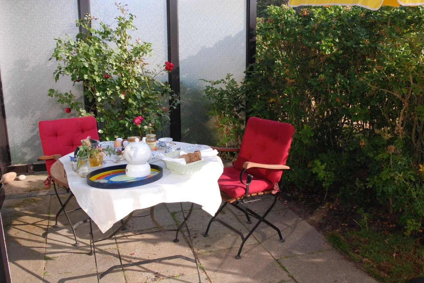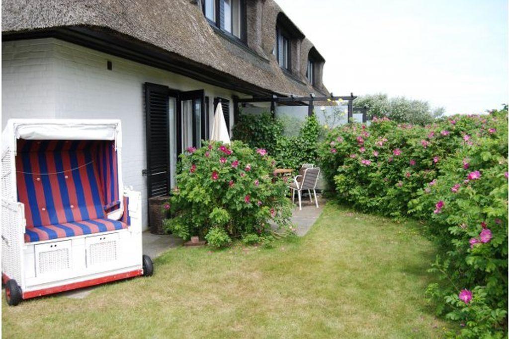 - Gartenterrasse mit ca. 80 m² durch Rosenhecke sichtgeschütztem Privatbereich mit Sitzecke, Strandkorb, Sonnenschirm und Zugang zum weitläufigen Wiesengelände