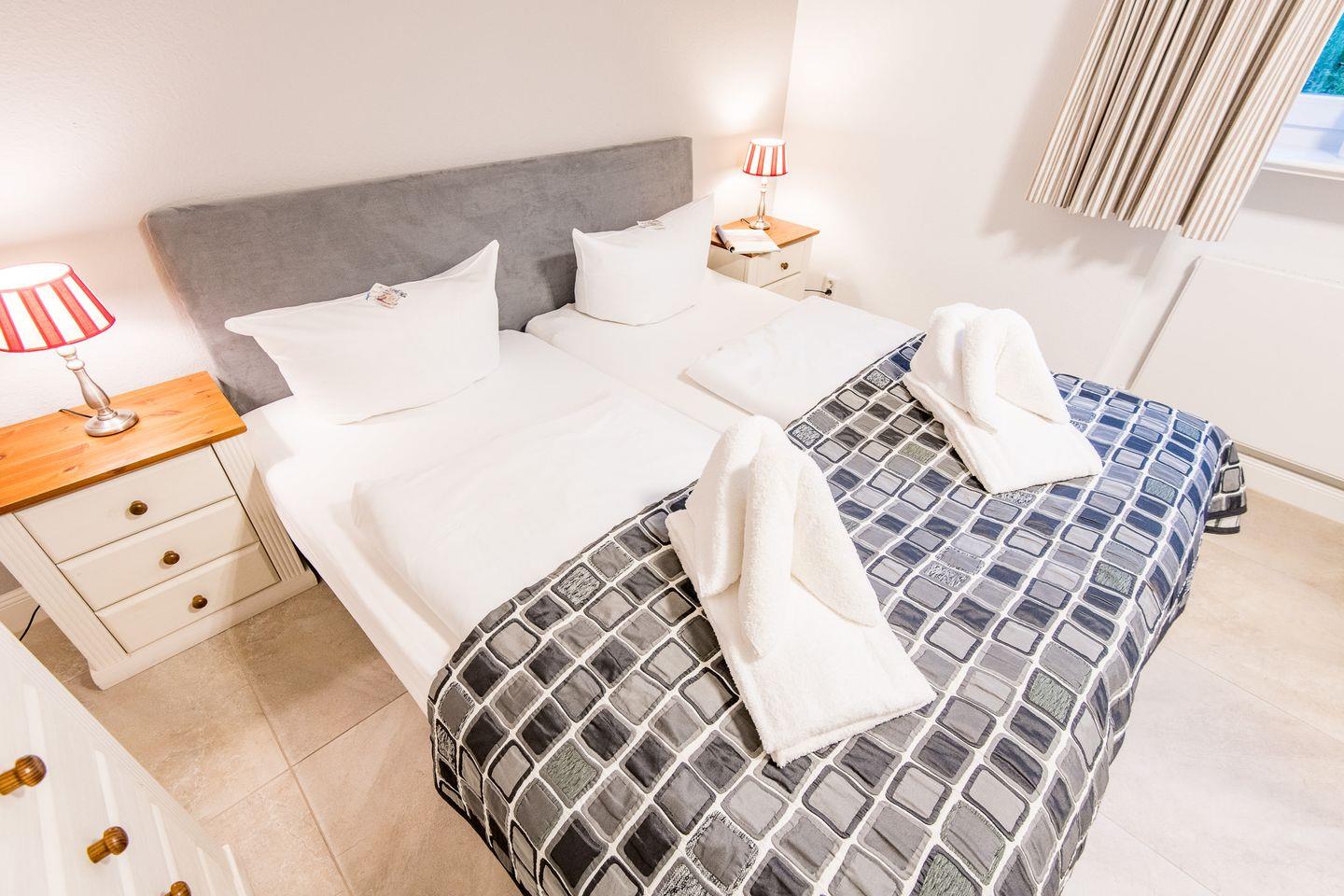 Das Hauptschlafzimmer ist mit einem Boxspringbett (180x200 cm), einem Kleiderschrank und einem TV eingerichtet und bietet Ihnen eine ruhige Rückzugsmöglichkeit. Das zweite Schlafzimmer, ebenfalls mit einem Boxspringbett (140x200 cm) und TV, eignet sich ideal für eine dritte Person.