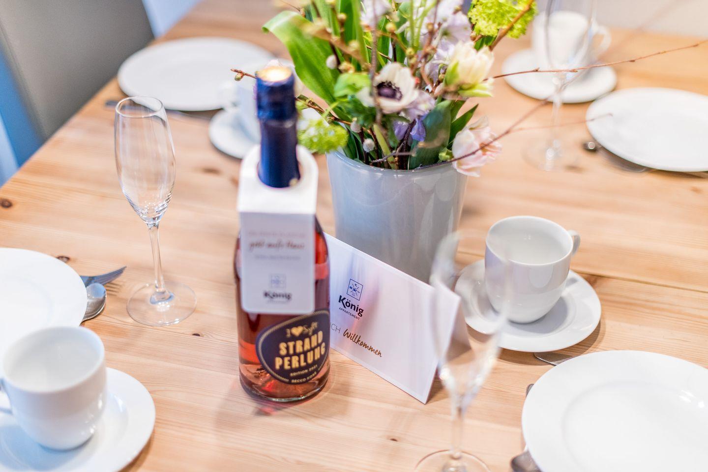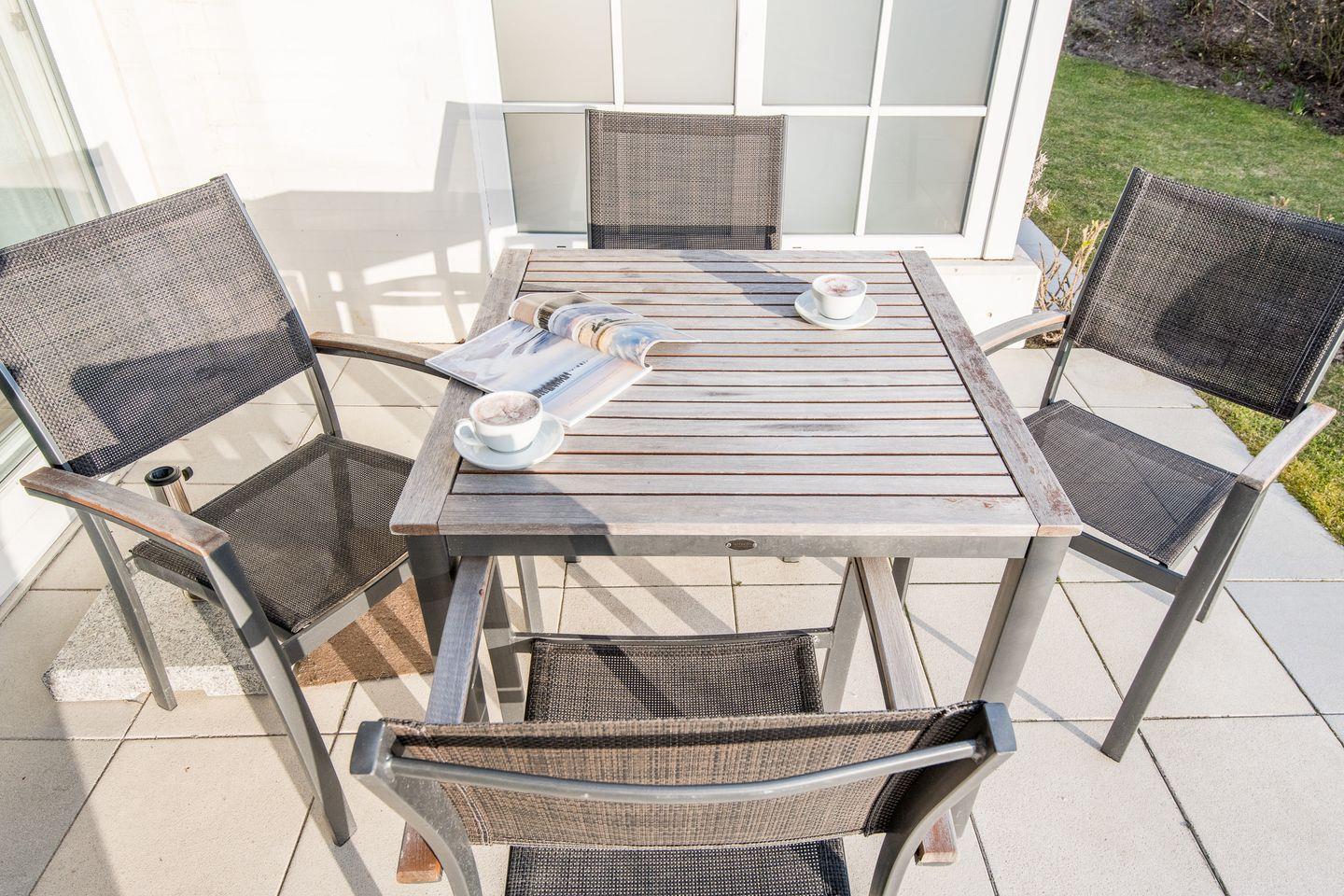 Der lichtdurchflutete Wohnbereich ist mit einer gemütlichen Sitzgarnitur, einem TV und einer SONOS Stereoanlage mit ausgestattet – ideal, um nach einem Strandtag zu entspannen. Ein Esstisch für 4 Personen bietet genügend Platz für gemeinsame Mahlzeiten. Von hier aus haben Sie direkten Zugang zur möblierten Südterrasse, wo Sie die Sonne und frische Luft in vollen Zügen genießen können.