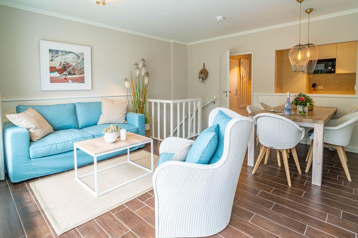 Die Ferienwohnung bietet Ihnen drei Zimmer auf zwei Ebenen (Erdgeschoss + Souterrain) mit ca. 70 qm Wohnfläche. Im EG befindet sich das große Wohnzimmer mit einem schönen Essbereich. Das Wohnzimmer ist mit einem Flatscreen-TV, einer Hifi-Anlage, einem DVD-Player und einem W-LAN-Anschluss ausgestattet. Außerdem verfügt das EG über eine halboffene, moderne Küche (Geschirrspüler, Backofen, Kaffemaschine) mit Durchreiche zum Esstisch und einem Schlafzimmer mit einem Doppelbett (140 x 200 cm). Im Souterrain sind das Duschbad mit WC und ein gemütliches Schlafzimmer mit großem Fenster, Doppelbett (180 x 200 cm) und Flatscreen-TV gelegen. Auf der wunderschönen Südterrasse mit Gartenmöbeln und Strandkorb (saisonal) lässt es sich besonders gut erholen!
