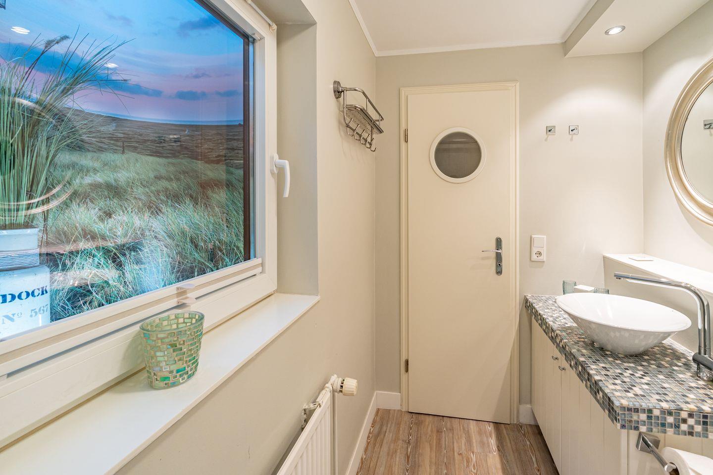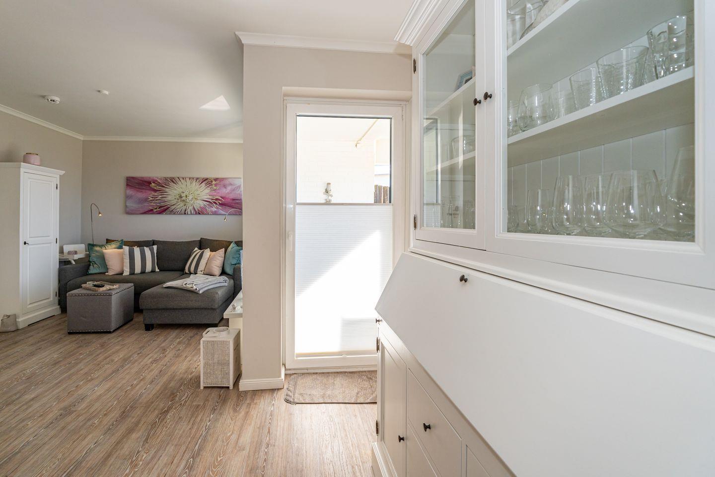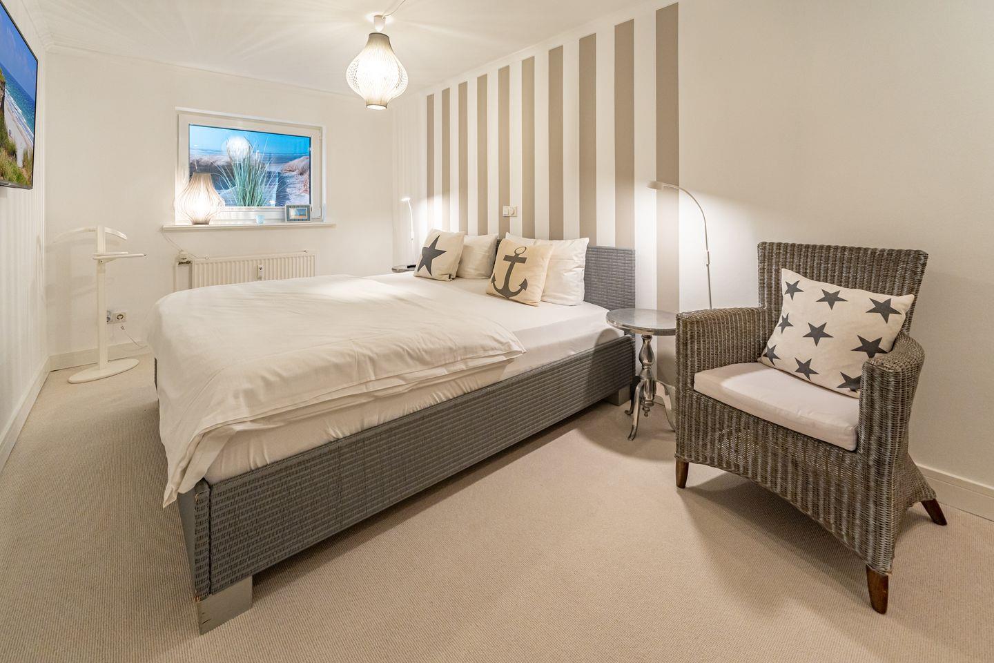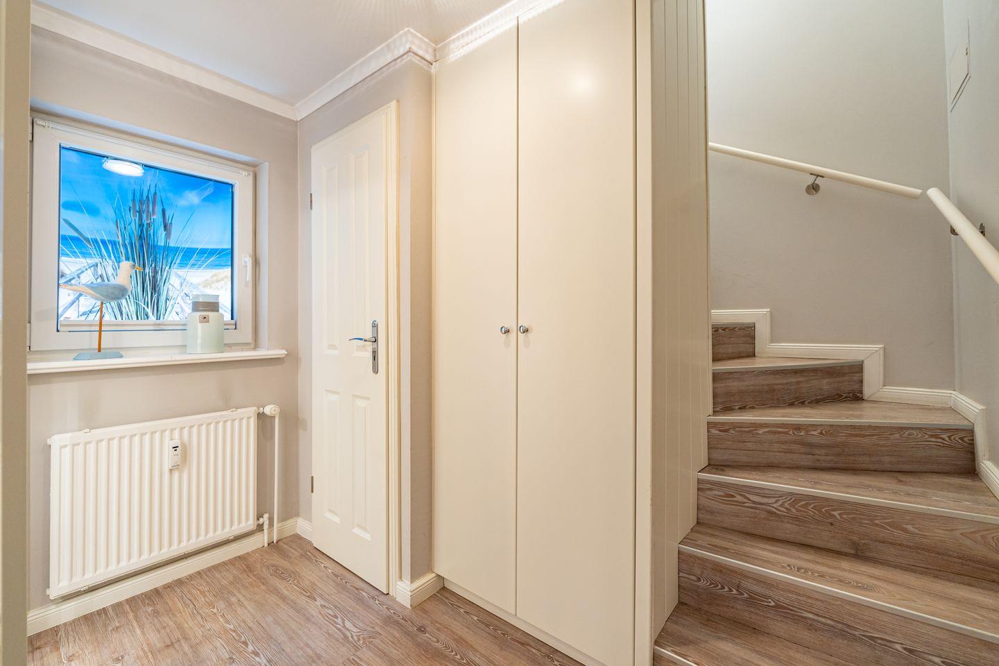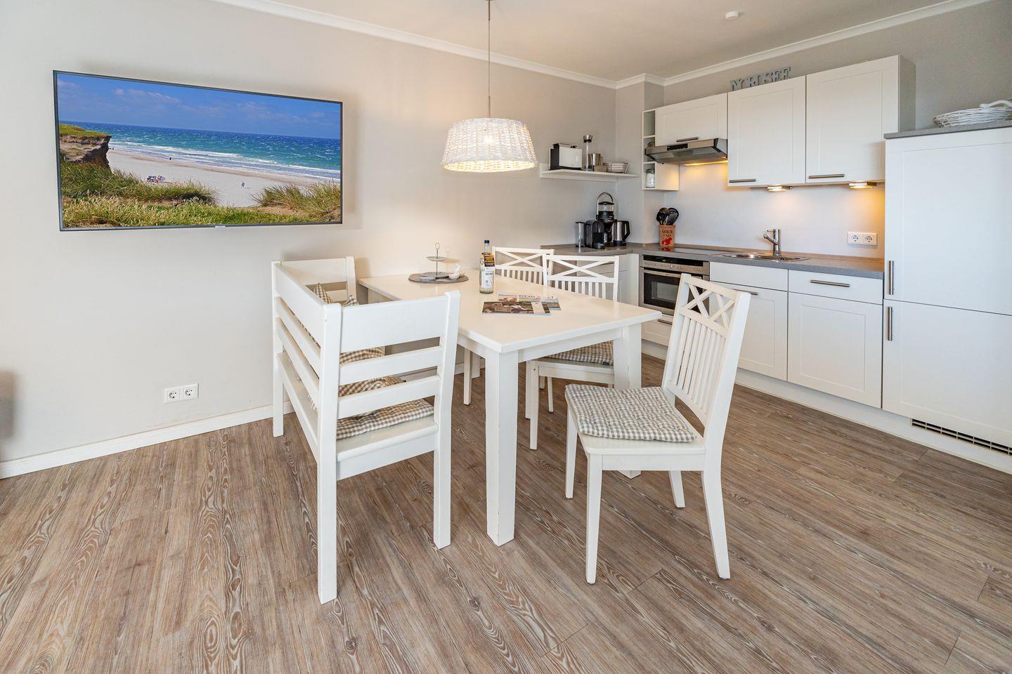 Im Erdgeschoss dieser Ferienwohnung befinden sich der Wohn- und Essbereich mit Sofa und ein SMART TV mit Magenta TV, eine voll ausgestattete, offene Küche (Spülmaschine, Cerankochfeld, Back-Kombi), ein Flur und das helle Duschbad mit WC. Vom Wohnbereich haben Sie Zugang zu der Terrasse mit Gartenmöbeln. Der Strandkorb steht Ihnen saisonal zur Verfügung. Im Souterrain liegen das zweite Duschbad mit WC und die beiden Schlafzimmer mit TV, eines mit Doppelbett (180 x 200 cm) und eines mit zwei Einzelbetten. In der Ferienwohnung steht Ihnen WLAN zur Verfügung. Eine Waschmaschine und ein Trockner sind im Gemeinschaftsraum (gegen Gebühr) vorhanden. Ein Pkw-Stellplatz gehört zu dieser Wohnung. Fahrradstellplätze befinden sich am Haus. Hunde sind auf Anfrage in dieser Ferienwohnung erlaubt (10,- € pro Tier/Tag). Weitere Bilder unter www.meerquartiere-sylt.de
