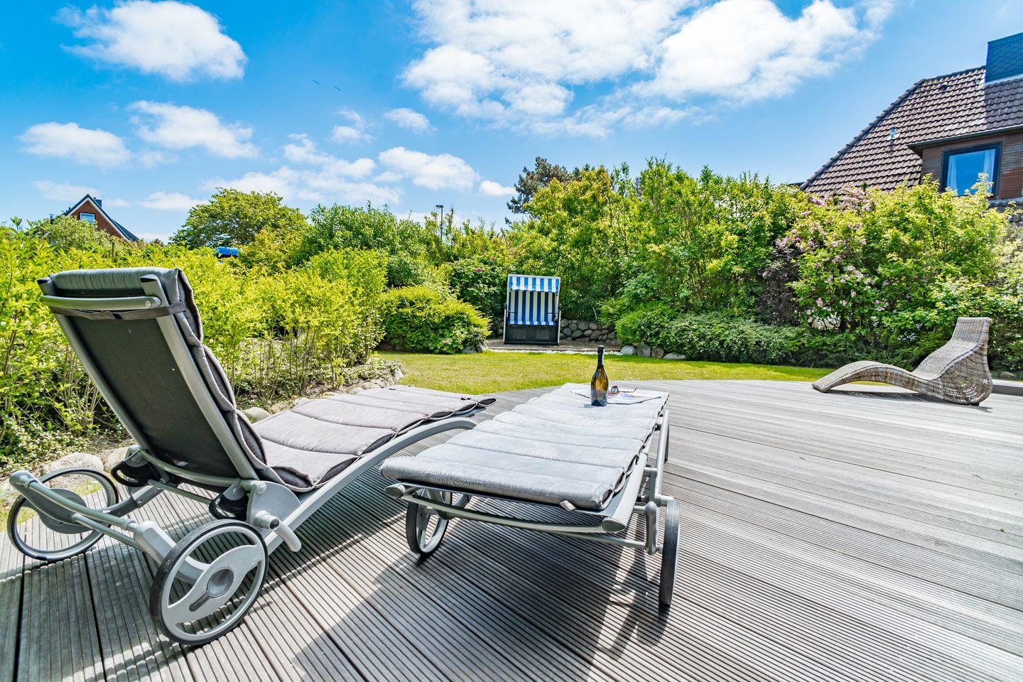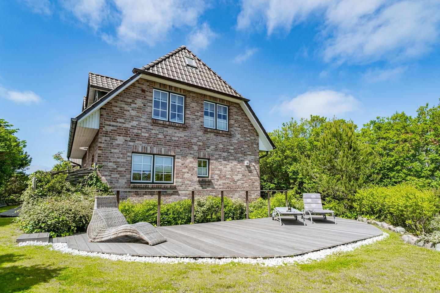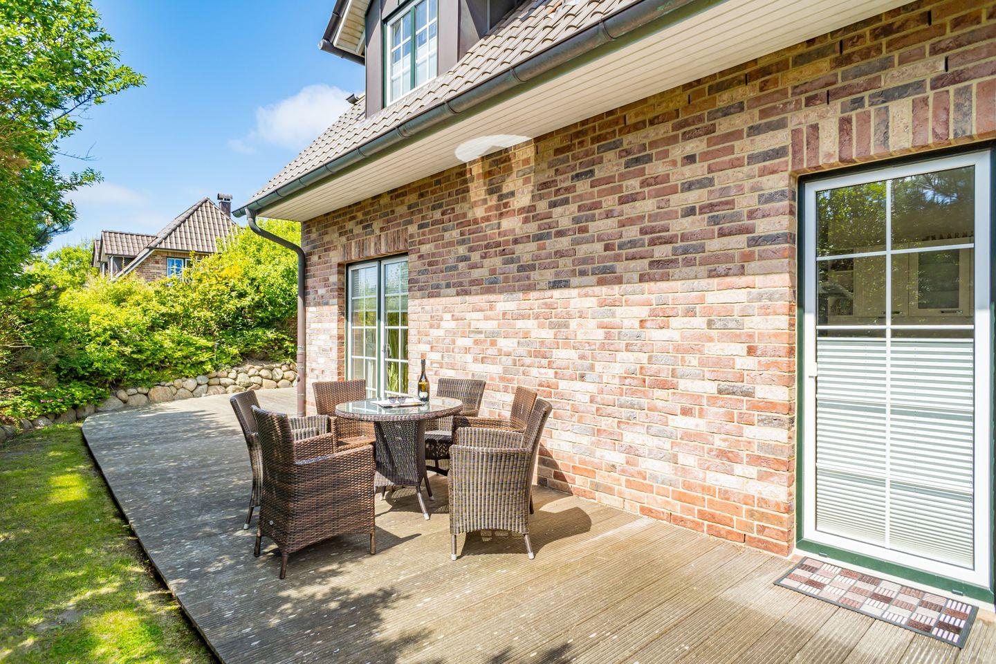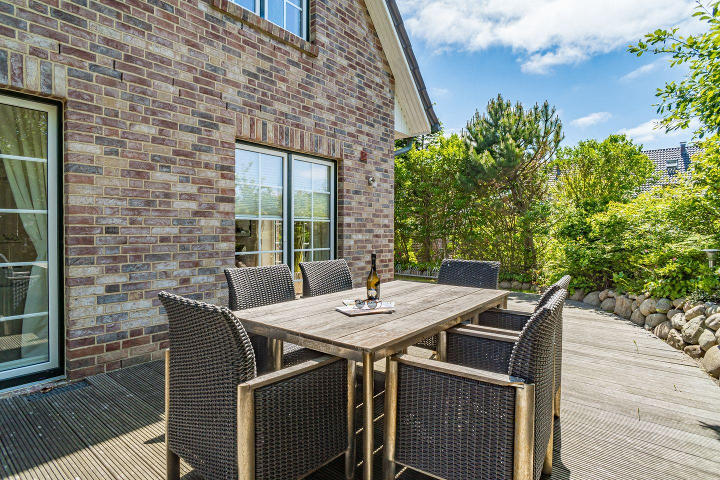 Im Erdgeschoss befindet sich der hell gestaltete, offene Wohnraum mit Sofa und TV. Ebenfalls zur Ausstattung gehört ein Mylin-Kachelofen. Angrenzend an den Wohnbereich befindet sich die offene, vollausgestattete Küche mit großem Esstisch. Vom Wohn- und Essbereich haben Sie Zutritt zur umlaufenden Terrasse in Südwestlicher Ausrichtung, mit Sylter Strandkorb und Gartenmöbeln (saisonal). Im Erdgeschoss befindet sich ebenfalls ein Badezimmer mit Dusche, Waschbecken und WC. Gelangt man über die Treppe in das Obergeschoss, findet man drei individuell dekorierte Schlafzimmer und ein modernes Wellnessbad mit großer runder Badewanne, Dusche und WC. Im Untergeschoss befindet sich die Waschmaschine und Trockner sowie die Sauna mit Dusche und WC.