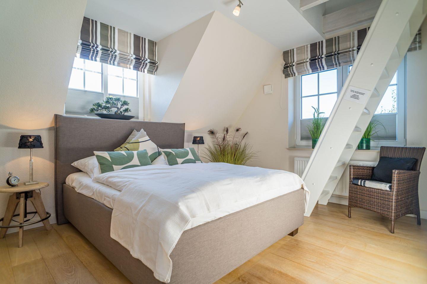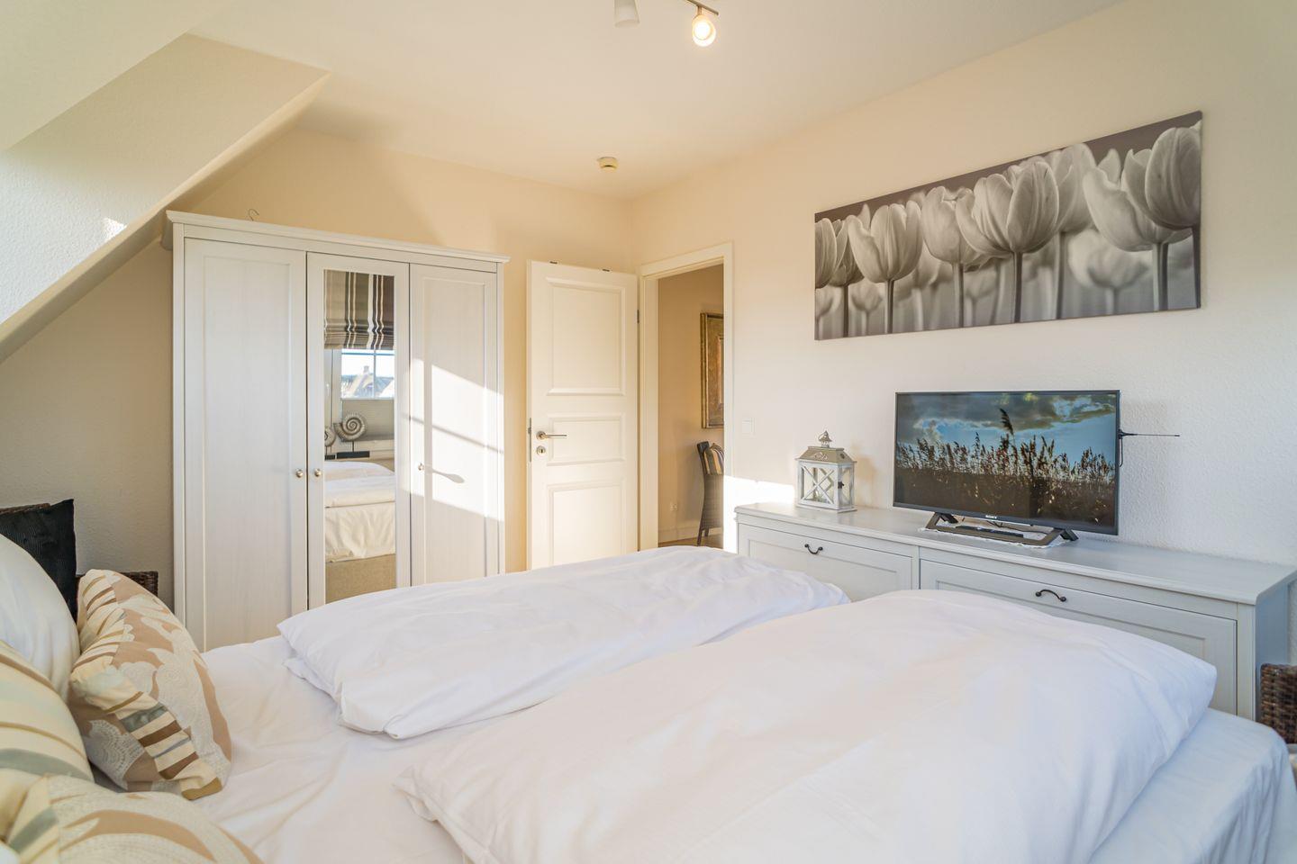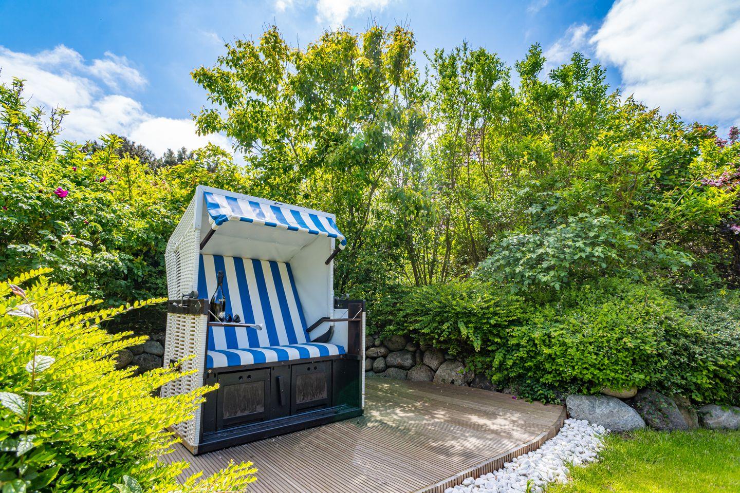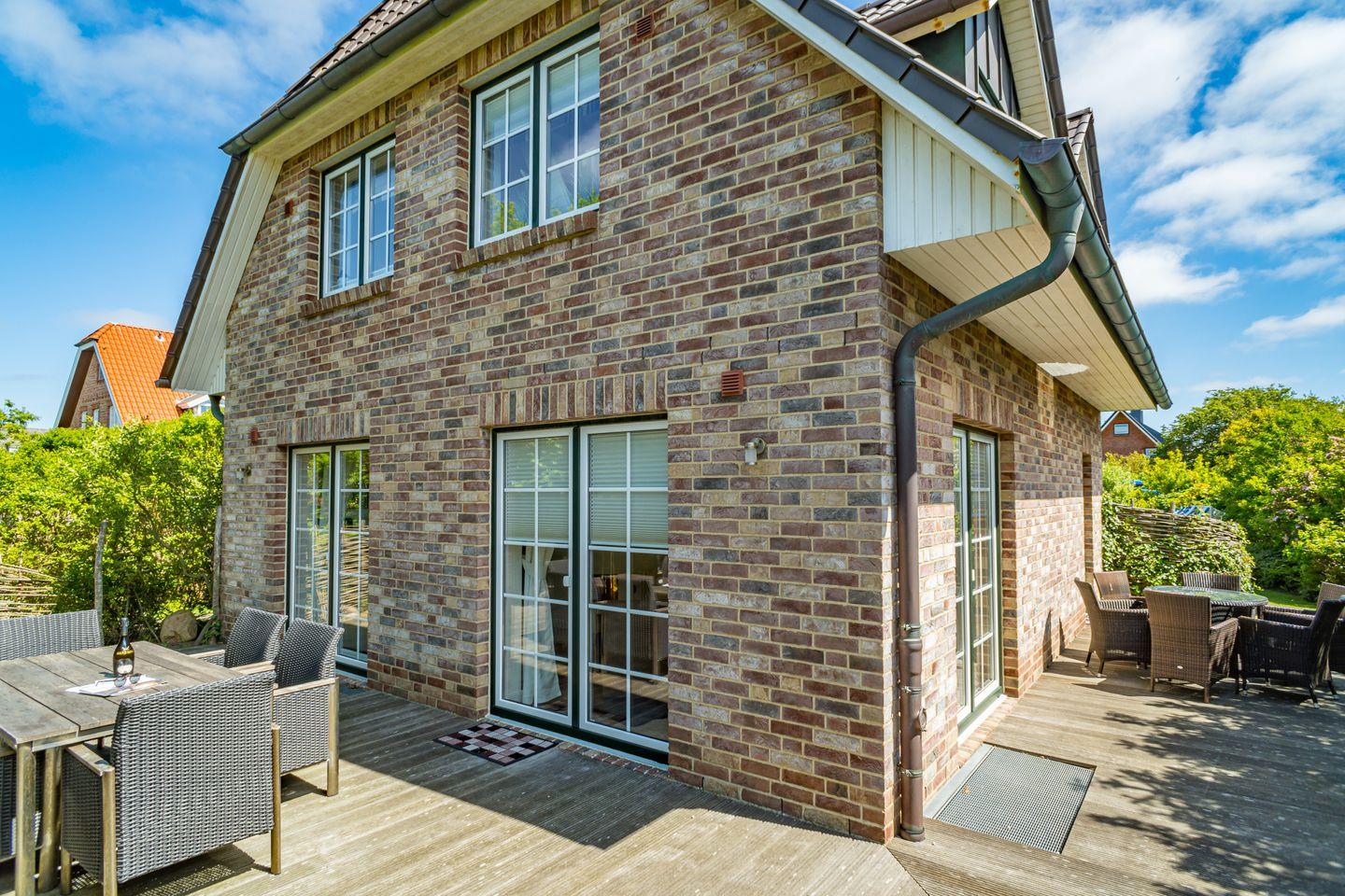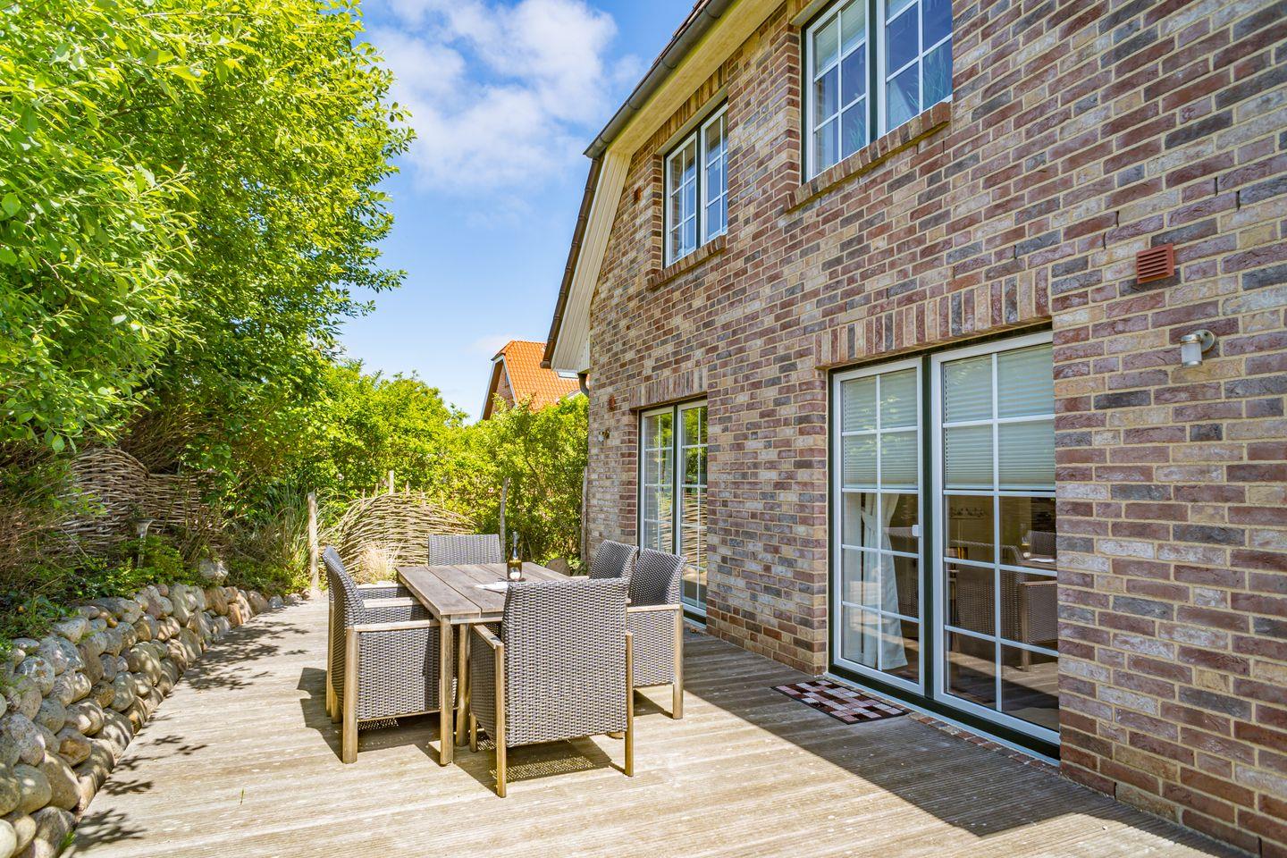 Im Erdgeschoss befindet sich der hell gestaltete, offene Wohnraum mit Sofa und TV. Ebenfalls zur Ausstattung gehört ein Mylin-Kachelofen. Angrenzend an den Wohnbereich befindet sich die offene, vollausgestattete Küche mit großem Esstisch. Vom Wohn- und Essbereich haben Sie Zutritt zur umlaufenden Terrasse in Südwestlicher Ausrichtung, mit Sylter Strandkorb und Gartenmöbeln (saisonal). Im Erdgeschoss befindet sich ebenfalls ein Badezimmer mit Dusche, Waschbecken und WC. Gelangt man über die Treppe in das Obergeschoss, findet man drei individuell dekorierte Schlafzimmer und ein modernes Wellnessbad mit großer runder Badewanne, Dusche und WC. Im Untergeschoss befindet sich die Waschmaschine und Trockner sowie die Sauna mit Dusche und WC.