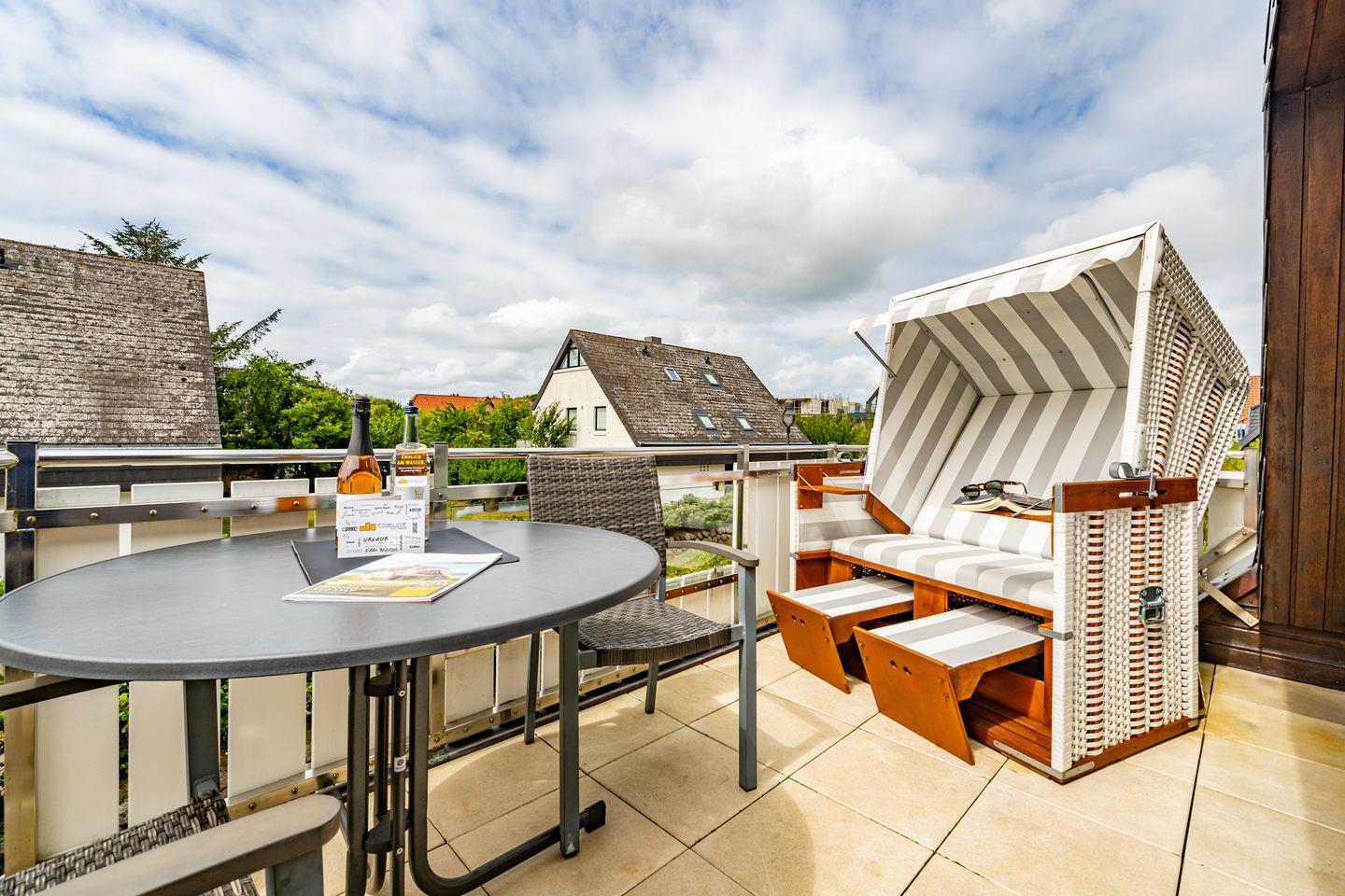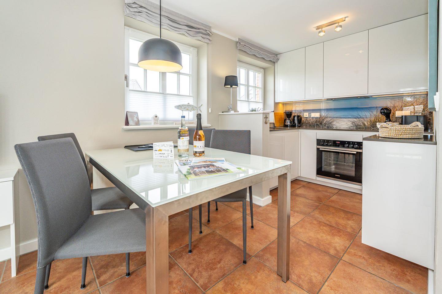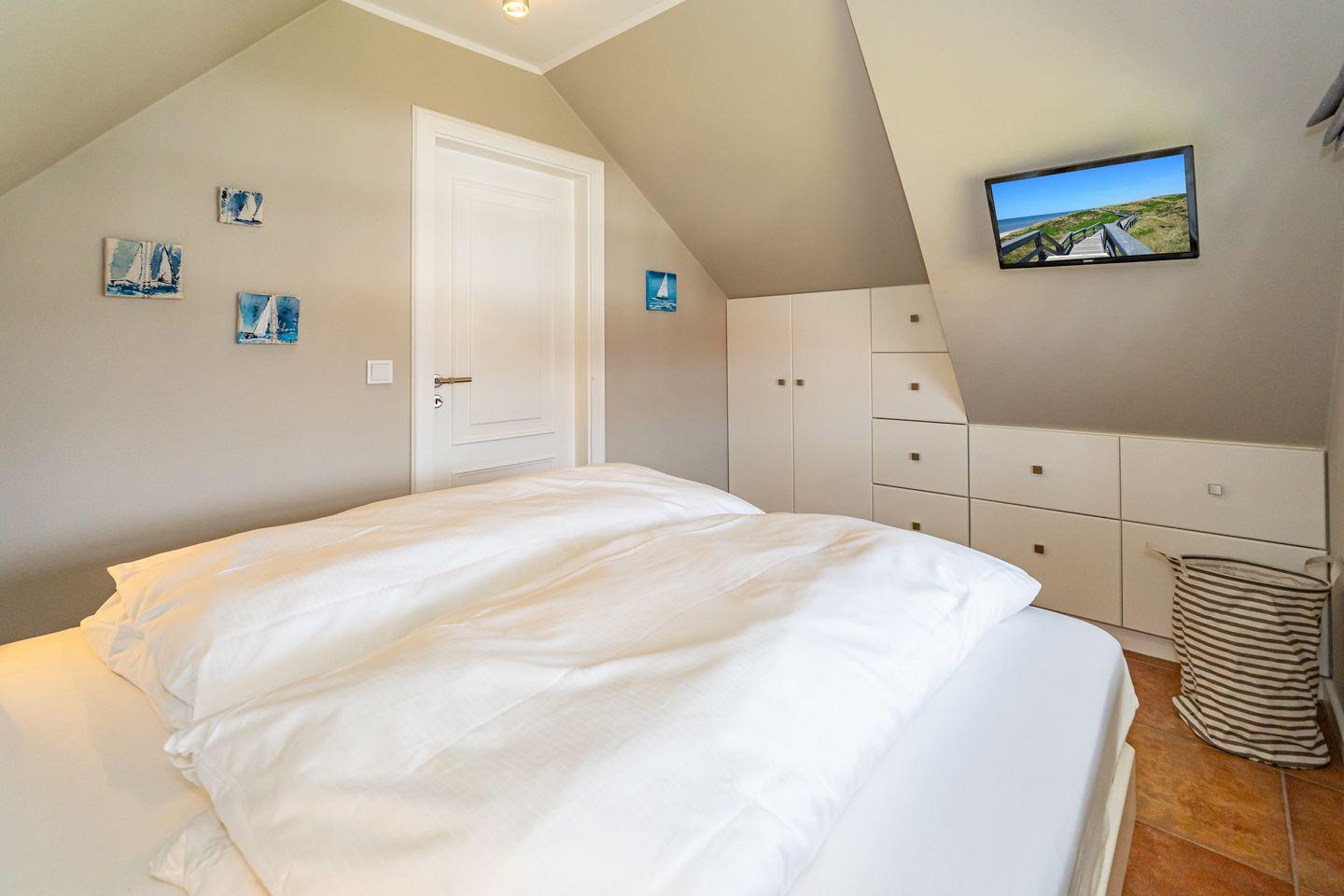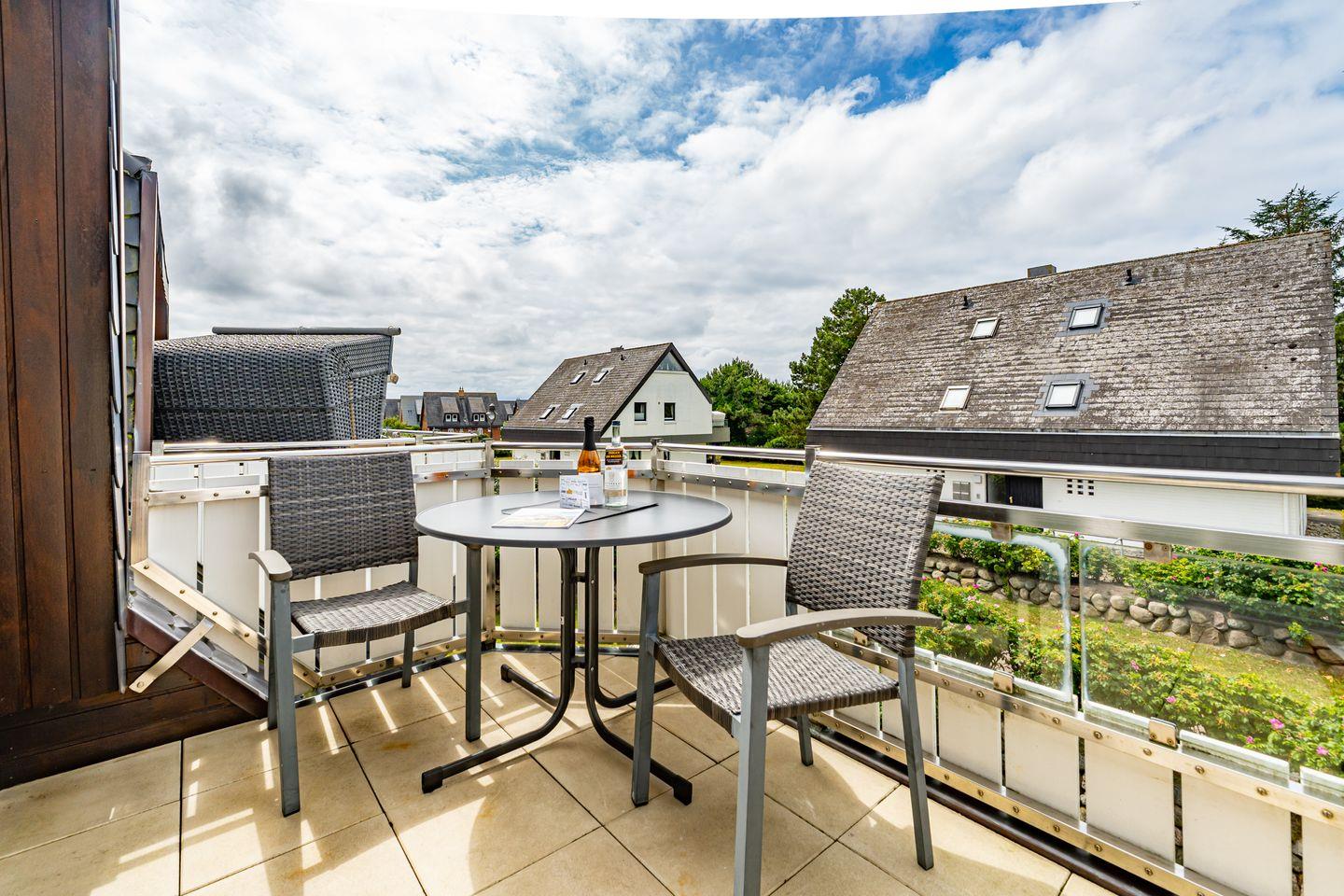 Die 3-Zimmer-Ferienwohnung befindet sich im 1.OG und DG. Vom Flur der Ferienwohnung aus erreichen Sie den hellen Wohn- und Essbereich mit gemütlicher Couch, TV und Essplatz. In der angrenzenden offenen Küche stehen Ihnen ein Geschirrspüler, Kühlschrank mit Gefrierfach , Mikrowelle und Kaffeefiltermaschine zur Verfügung. Vom Wohn- und Essbereich haben Sie Zutritt zum Balkon mit Gartenmöbeln und typischen Sylter Strandkorb. Ebenfalls im 1. OG der Ferienwohnung befindet sich eines der beiden Schlafzimmer (Doppelbett 140x200cm) mit TV und das Badezimmer mit Dusche. Über eine Treppe gelangen Sie in das Dachgeschoss mit Schlafzimmer (Doppelbett 180x200cm) und TV. Hier befindet sich auch ein separates Gäste WC mit Toilette. Zur Ferienwohnung gehört ein kostenfreier Stellplatz. WLAN ist selbstverständlich vorhanden. In dieser Ferienwohnung sind leider keine Haustiere erlaubt. Die Ferienwohnung verfügt über einen praktischen Kombi-Waschtrockner.