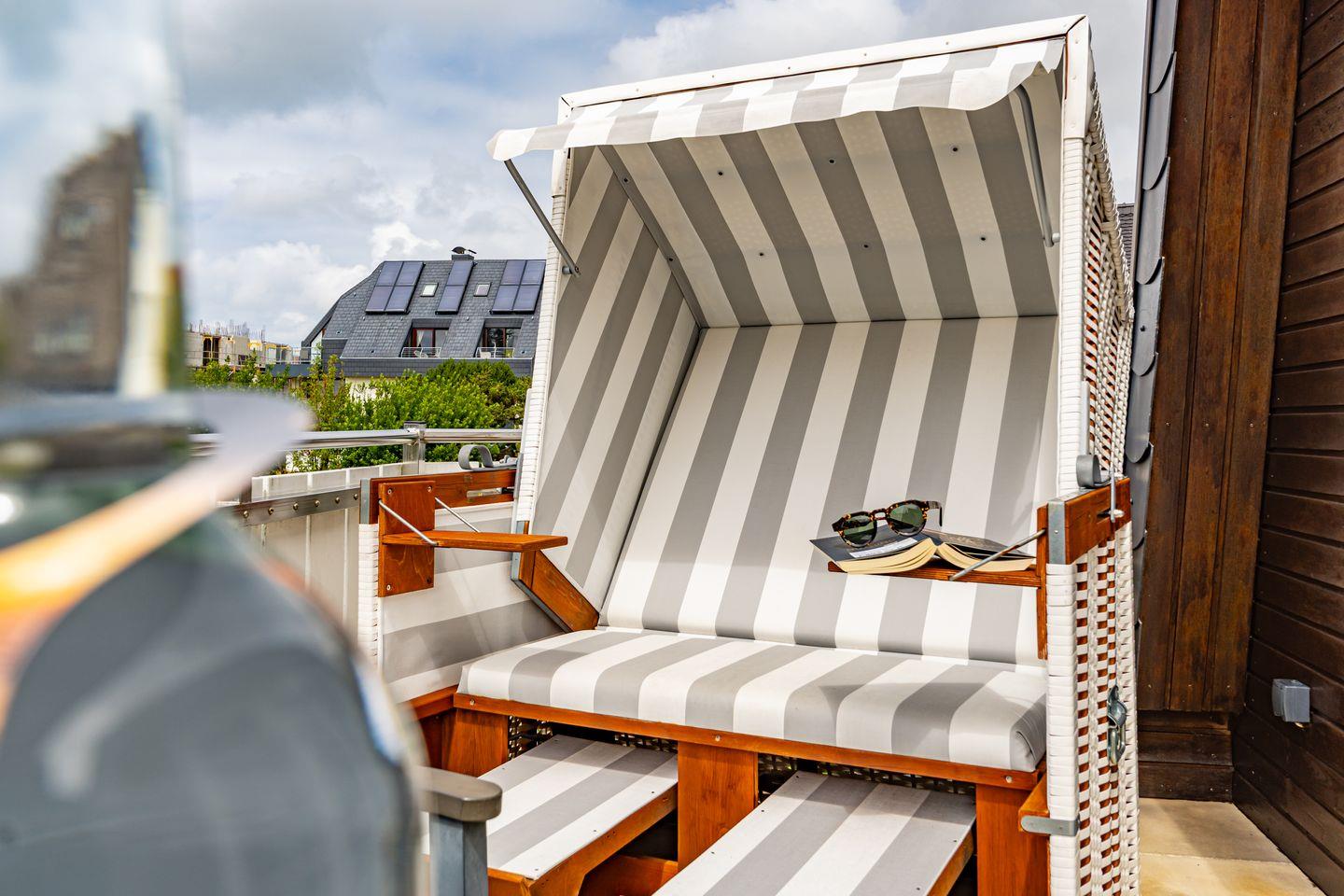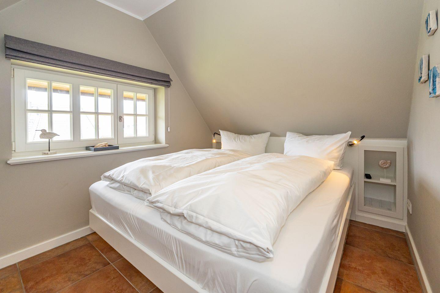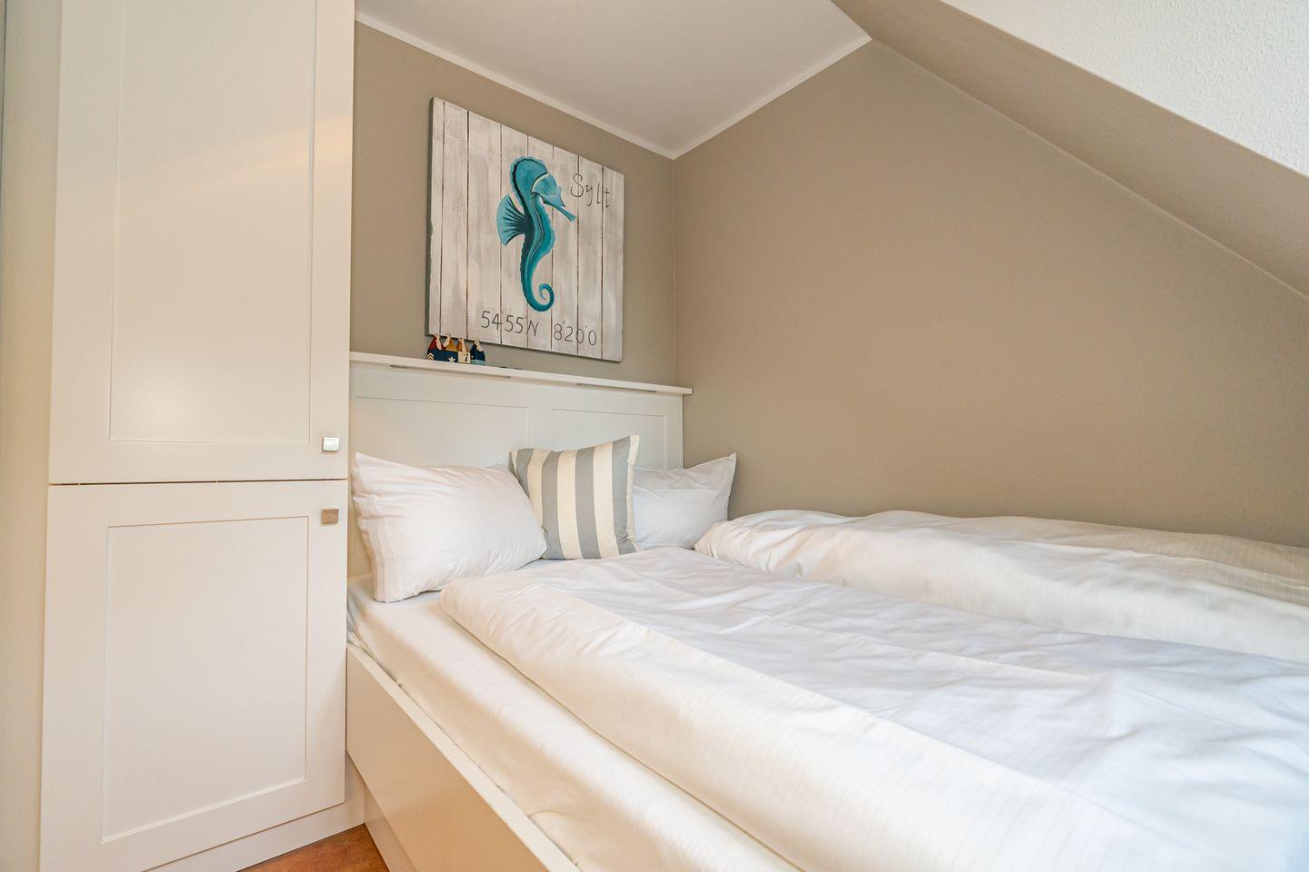 Die 3-Zimmer-Ferienwohnung befindet sich im 1.OG und DG. Vom Flur der Ferienwohnung aus erreichen Sie den hellen Wohn- und Essbereich mit gemütlicher Couch, TV und Essplatz. In der angrenzenden offenen Küche stehen Ihnen ein Geschirrspüler, Kühlschrank mit Gefrierfach , Mikrowelle und Kaffeefiltermaschine zur Verfügung. Vom Wohn- und Essbereich haben Sie Zutritt zum Balkon mit Gartenmöbeln und typischen Sylter Strandkorb. Ebenfalls im 1. OG der Ferienwohnung befindet sich eines der beiden Schlafzimmer (Doppelbett 140x200cm) mit TV und das Badezimmer mit Dusche. Über eine Treppe gelangen Sie in das Dachgeschoss mit Schlafzimmer (Doppelbett 180x200cm) und TV. Hier befindet sich auch ein separates Gäste WC mit Toilette. Zur Ferienwohnung gehört ein kostenfreier Stellplatz. WLAN ist selbstverständlich vorhanden. In dieser Ferienwohnung sind leider keine Haustiere erlaubt. Die Ferienwohnung verfügt über einen praktischen Kombi-Waschtrockner.