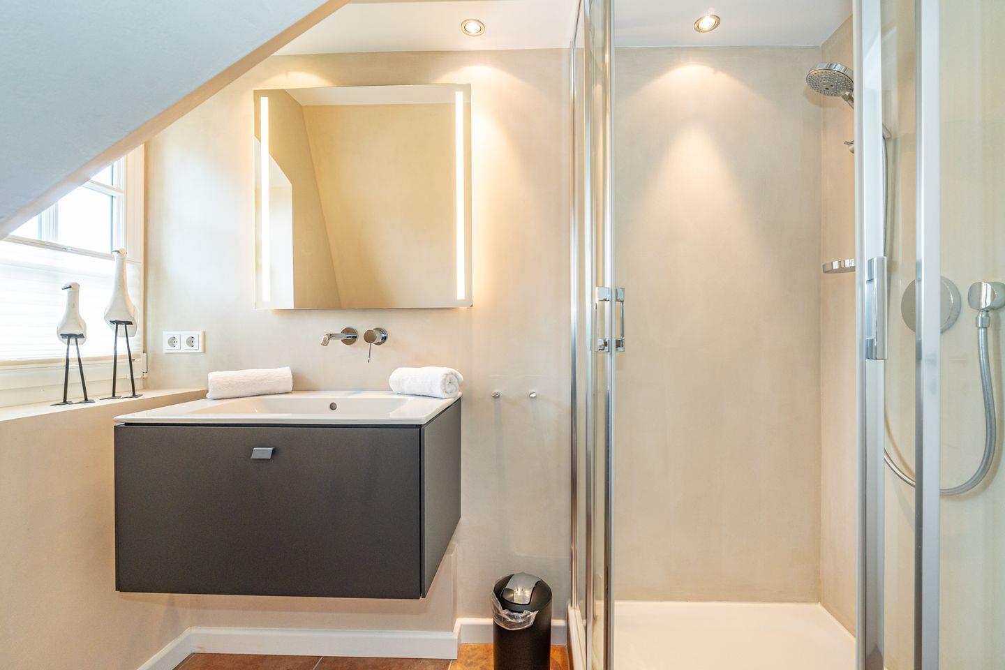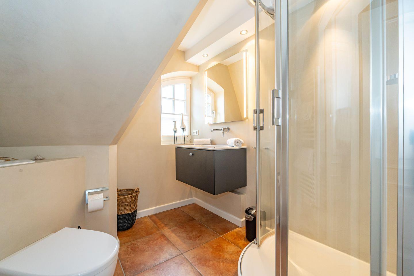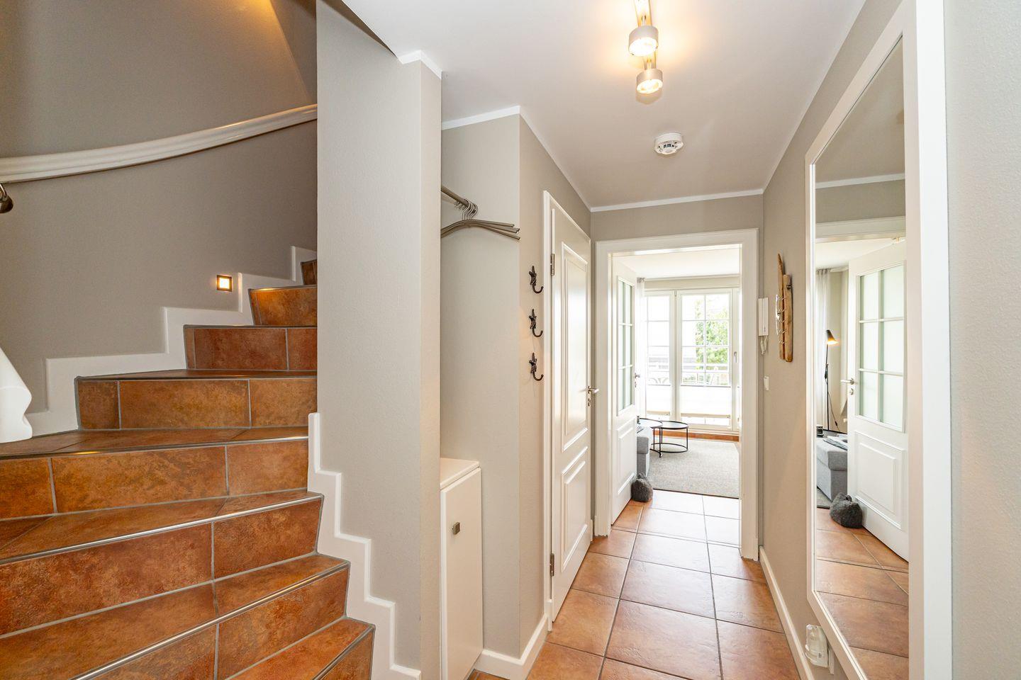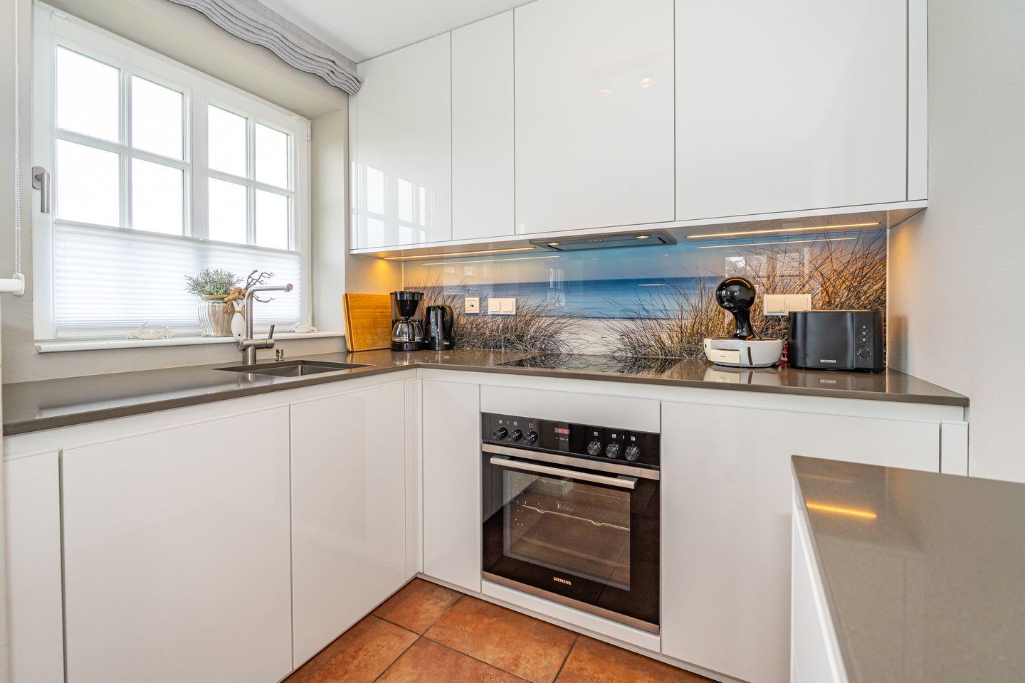 Die 3-Zimmer-Ferienwohnung befindet sich im 1.OG und DG. Vom Flur der Ferienwohnung aus erreichen Sie den hellen Wohn- und Essbereich mit gemütlicher Couch, TV und Essplatz. In der angrenzenden offenen Küche stehen Ihnen ein Geschirrspüler, Kühlschrank mit Gefrierfach , Mikrowelle und Kaffeefiltermaschine zur Verfügung. Vom Wohn- und Essbereich haben Sie Zutritt zum Balkon mit Gartenmöbeln und typischen Sylter Strandkorb. Ebenfalls im 1. OG der Ferienwohnung befindet sich eines der beiden Schlafzimmer (Doppelbett 140x200cm) mit TV und das Badezimmer mit Dusche. Über eine Treppe gelangen Sie in das Dachgeschoss mit Schlafzimmer (Doppelbett 180x200cm) und TV. Hier befindet sich auch ein separates Gäste WC mit Toilette. Zur Ferienwohnung gehört ein kostenfreier Stellplatz. WLAN ist selbstverständlich vorhanden. In dieser Ferienwohnung sind leider keine Haustiere erlaubt. Die Ferienwohnung verfügt über einen praktischen Kombi-Waschtrockner.