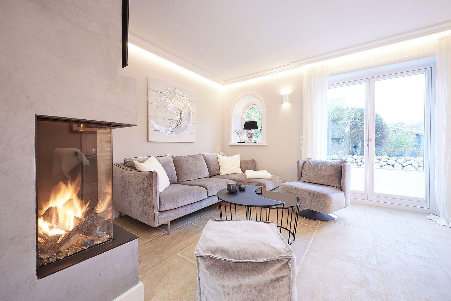 Das lichtdurchflutete Wohn- und Esszimmer verführt mit einem gemütlichen Gaskamin und einer stilvollen Couch – der perfekte Ort, um nach einem Tag am Strand zu entspannen. Von hier aus gelangen Sie direkt in den Garten und auf zwei Terrassen, die mit Gartenmöbeln ausgestattet sind. Diese bieten Ihnen ausreichend Platz, um im Freien zu entspannen oder gesellige Grillabende zu genießen. Der Esstisch, direkt neben dem Kamin, lädt zu langen, gemütlichen Abenden ein.