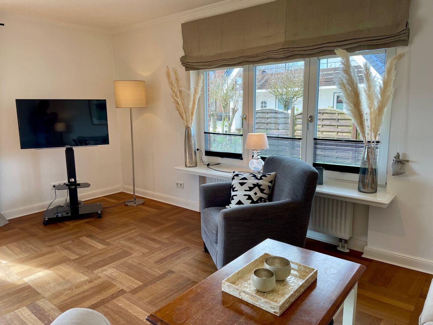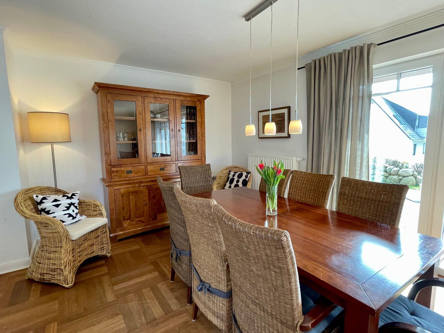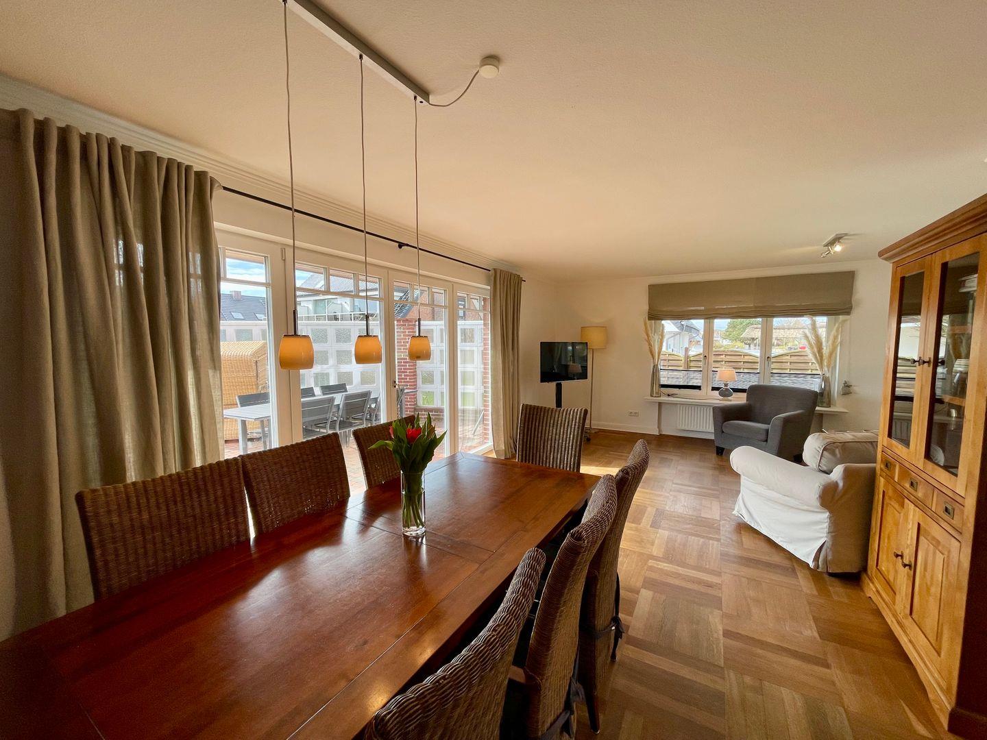 Die separate Küche ist modern ausgestattet und lädt zu gemeinsamen Kochabenden ein. Das Herzstück des Hauses bildet das großzügige Wohnzimmer mit edlem Parkettboden, einem geräumigen Esstisch und einer gemütlichen Sitzgarnitur – ideal für gesellige Stunden oder ruhige Abende. Von hier aus gelangen Sie direkt auf die wind- und sichtgeschützte Terrasse, ausgestattet mit Gartenmöbeln und eigenem Strandkorb, perfekt für entspannte Momente an der frischen Luft.