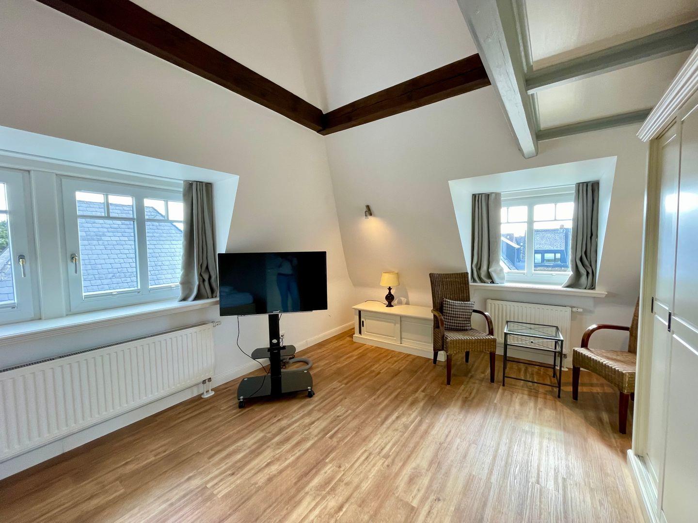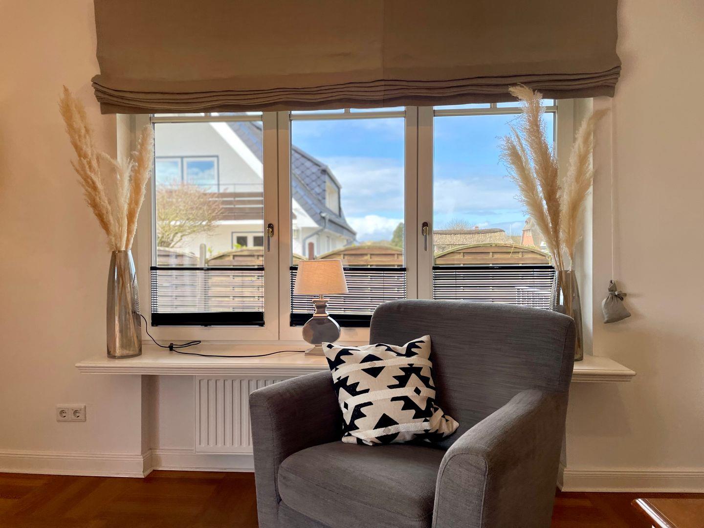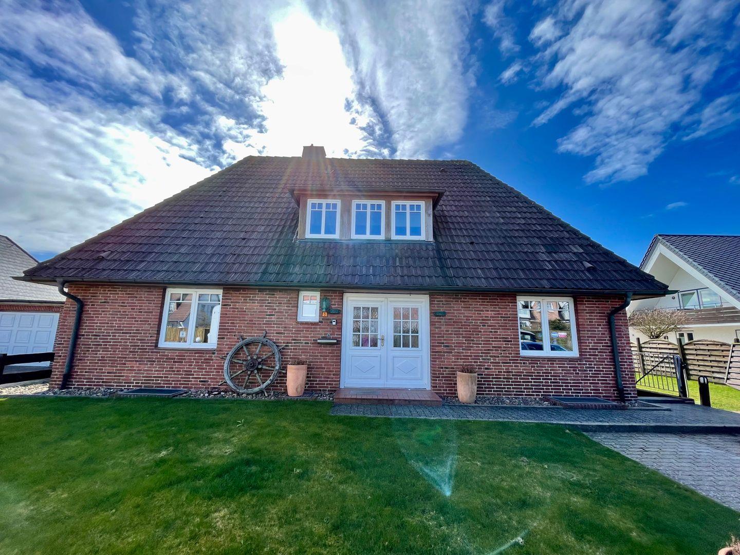 Die separate Küche ist modern ausgestattet und lädt zu gemeinsamen Kochabenden ein. Das Herzstück des Hauses bildet das großzügige Wohnzimmer mit edlem Parkettboden, einem geräumigen Esstisch und einer gemütlichen Sitzgarnitur – ideal für gesellige Stunden oder ruhige Abende. Von hier aus gelangen Sie direkt auf die wind- und sichtgeschützte Terrasse, ausgestattet mit Gartenmöbeln und eigenem Strandkorb, perfekt für entspannte Momente an der frischen Luft.