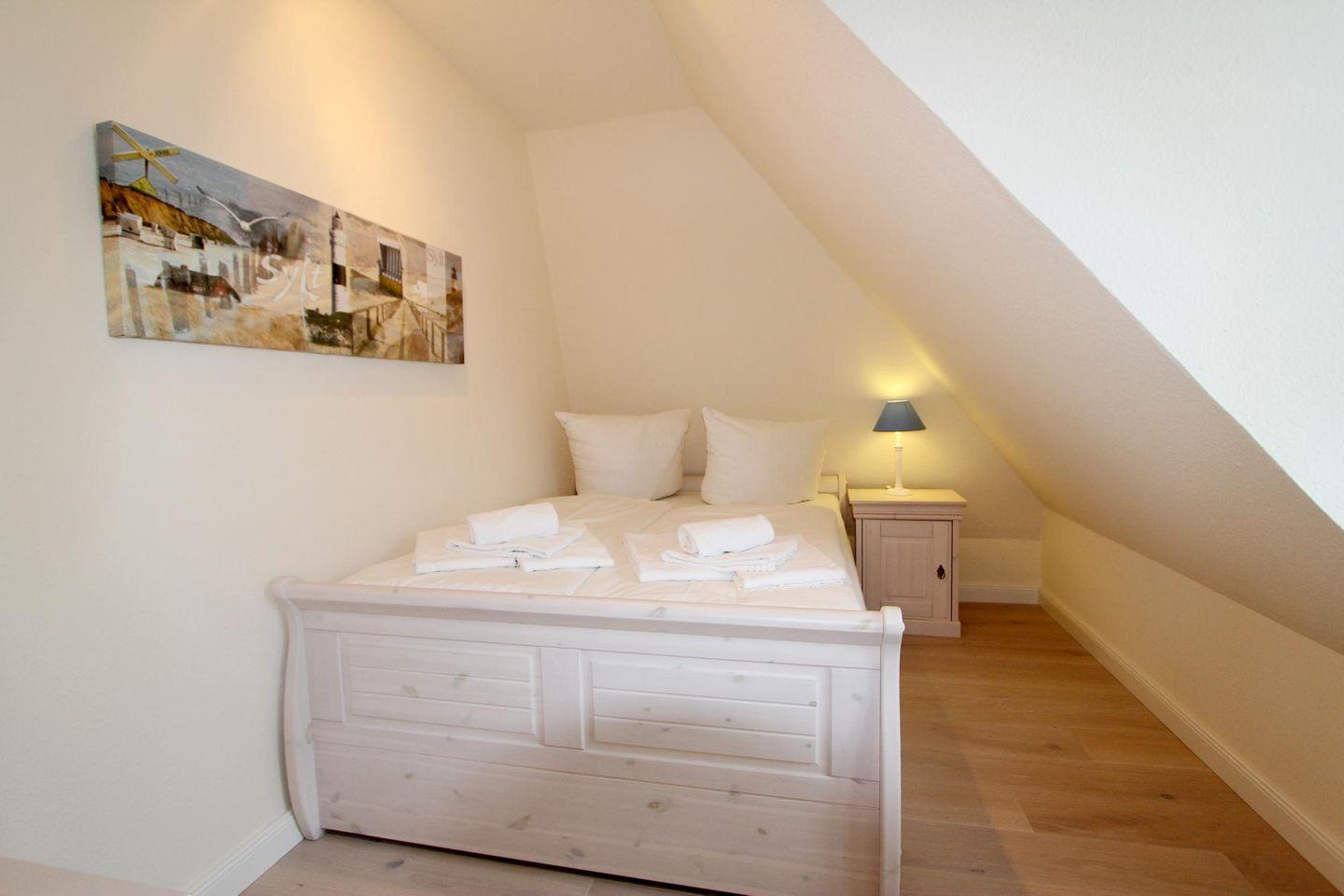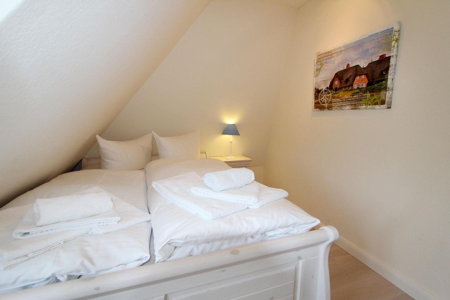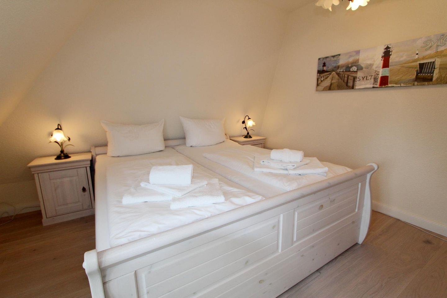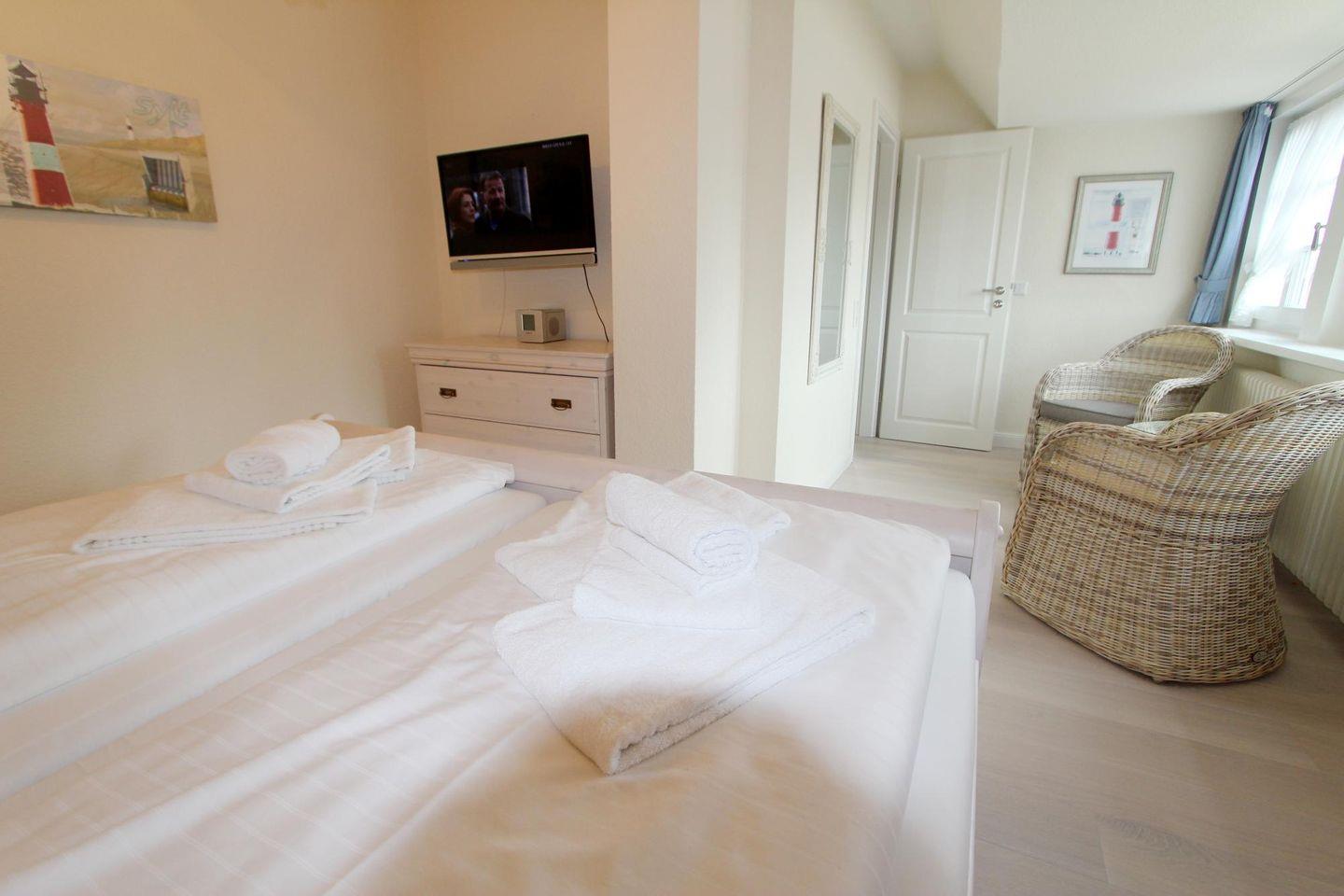 Das Ferienhaus verfügt über drei Schlafzimmer, die sich alle im Obergeschoss befinden. Der erste Schlafraum ist mit einem komfortablen Doppelbett ausgestattet und bietet ein zweites TV-Gerät sowie zwei bequeme Korbsessel. Ferner schlafen Sie in den weiteren beiden Schlafzimmern in französischen Doppelbetten.