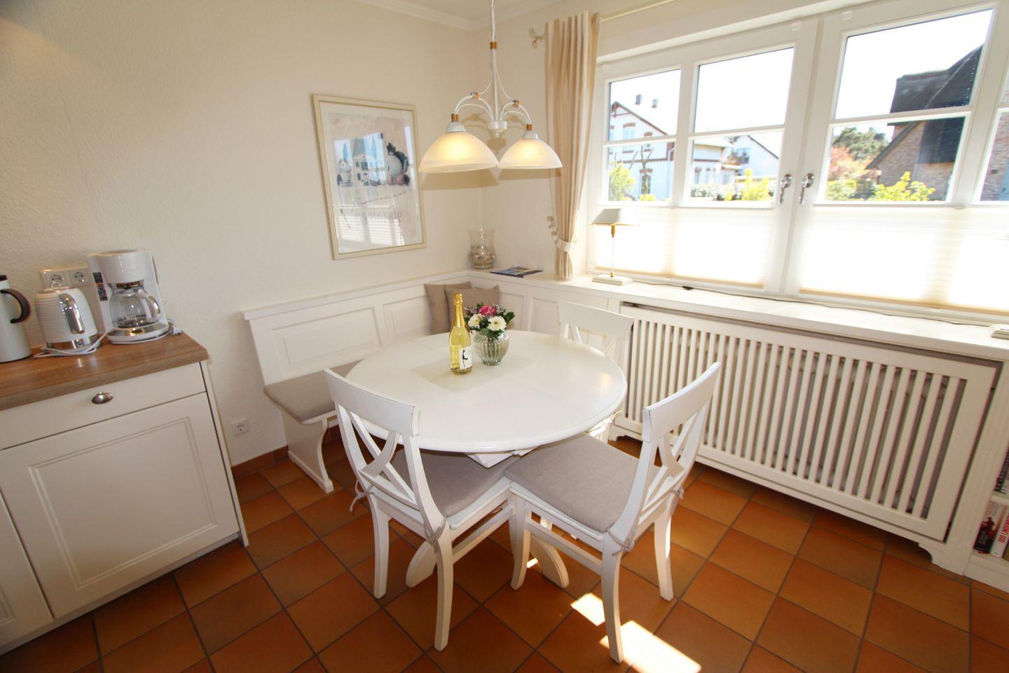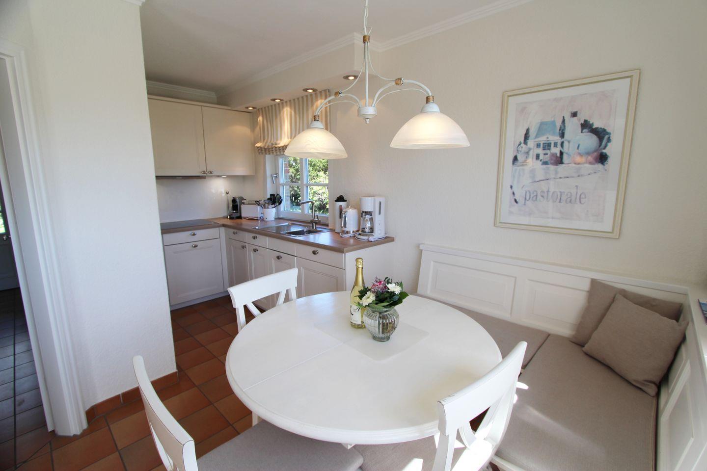 In einem klassisch-nordischen Stil gehalten befindet sich die Küche an den Wohnraum angrenzend und ist umfassend ausgestattet. Der Esstisch mit einer urgemütlichen Sitzbank bietet Platz für bis zu sechs Personen. Hier kann nach Herzenslust gespeist werden.