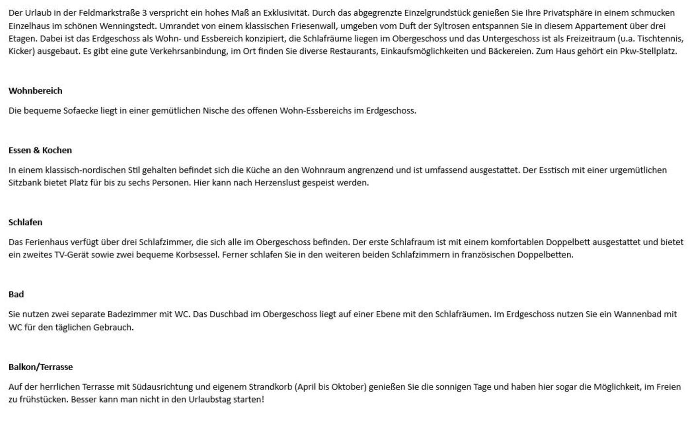 Der Urlaub in der Feldmarkstraße 3 verspricht ein hohes Maß an Exklusivität. Durch das abgegrenzte Einzelgrundstück genießen Sie Ihre Privatsphäre in einem schmucken Einzelhaus im schönen Wenningstedt. Umrandet von einem klassischen Friesenwall, umgeben vom Duft der Syltrosen entspannen Sie in diesem Appartement über drei Etagen. Dabei ist das Erdgeschoss als Wohn- und Essbereich konzipiert, die Schlafräume liegen im Obergeschoss und das Untergeschoss ist als Freizeitraum (u.a. Tischtennis, Kicker) ausgebaut. Es gibt eine gute Verkehrsanbindung, im Ort finden Sie diverse Restaurants, Einkaufsmöglichkeiten und Bäckereien. Zum Haus gehört ein Pkw-Stellplatz.