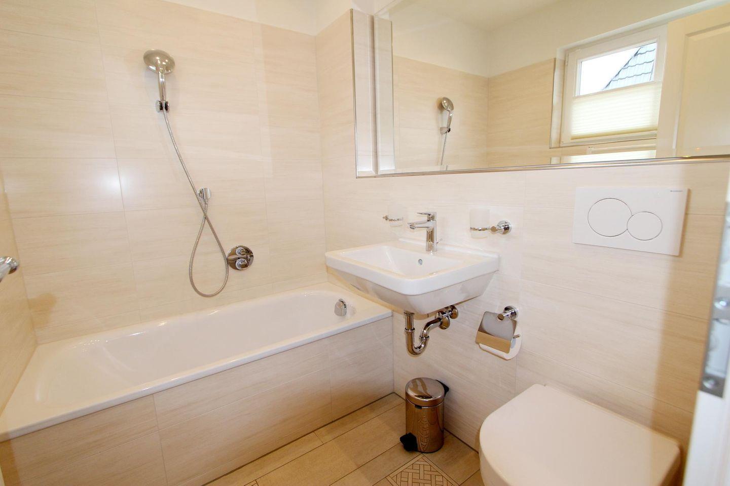 Sie nutzen zwei separate Badezimmer mit WC. Das Duschbad im Obergeschoss liegt auf einer Ebene mit den Schlafräumen. Im Erdgeschoss nutzen Sie ein Wannenbad mit WC für den täglichen Gebrauch.