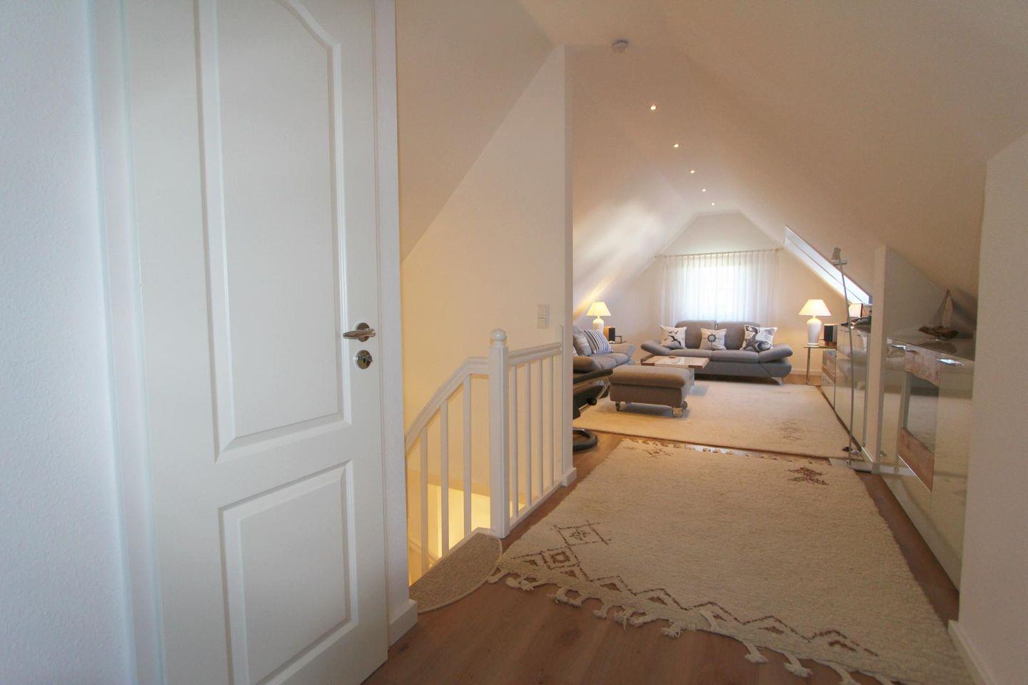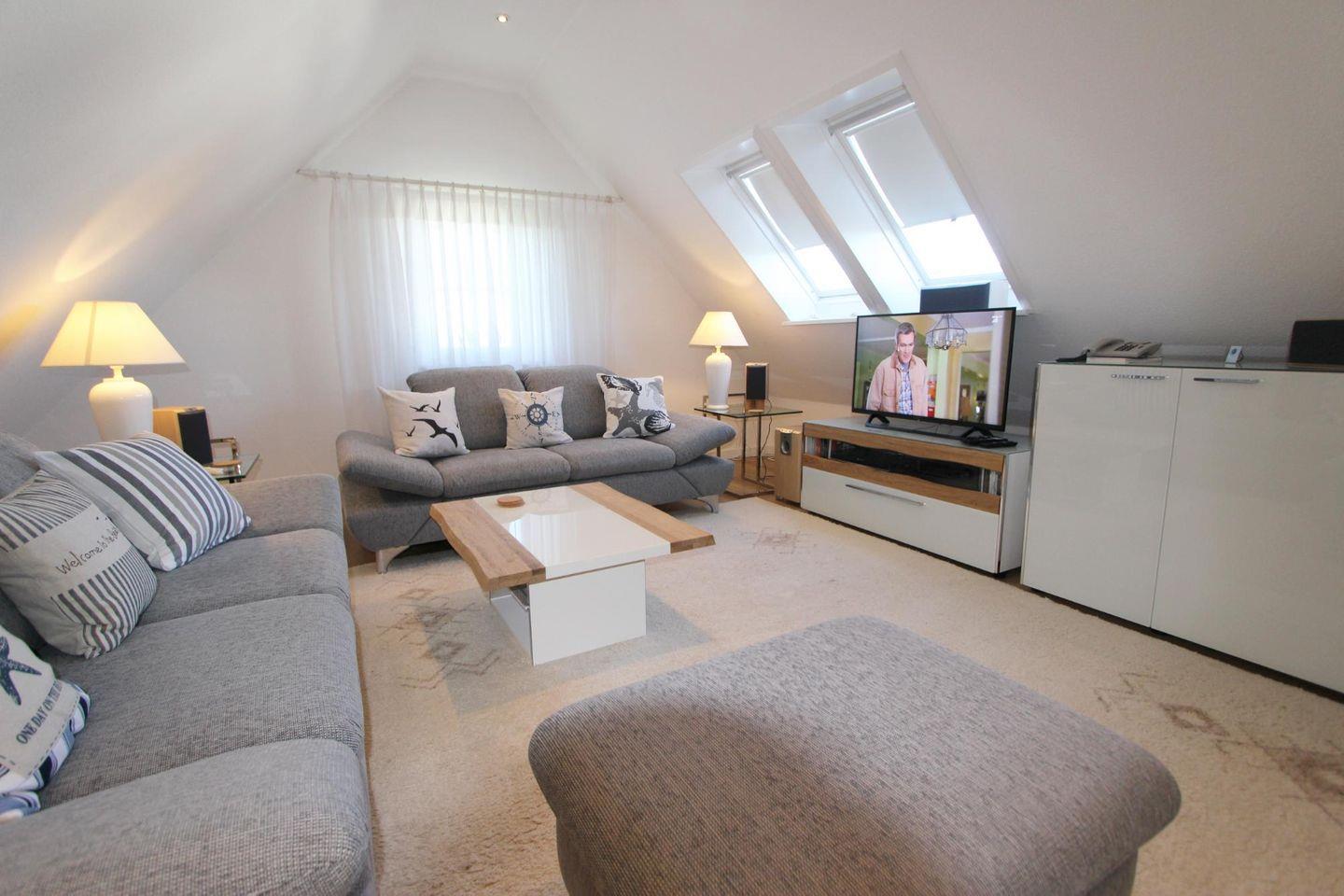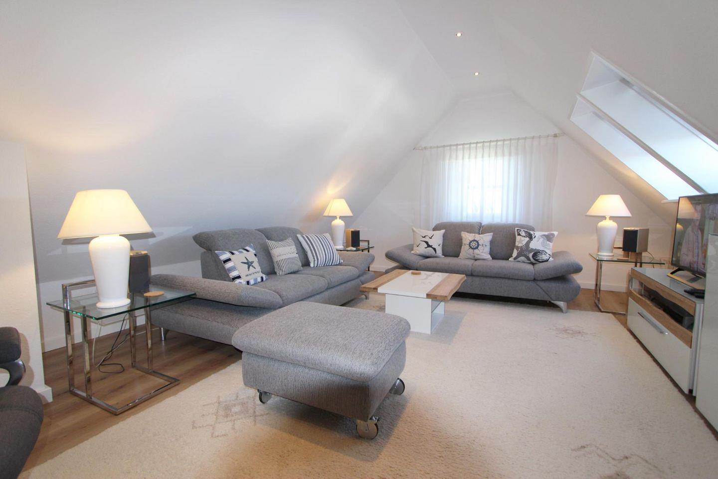 Der Wohnbereich befindet sich im Dachgeschoss und ist durch einen zeitgemäßen Einrichtungsstil geprägt. Die bequemen Sofas bieten viel Platz für Erholung.