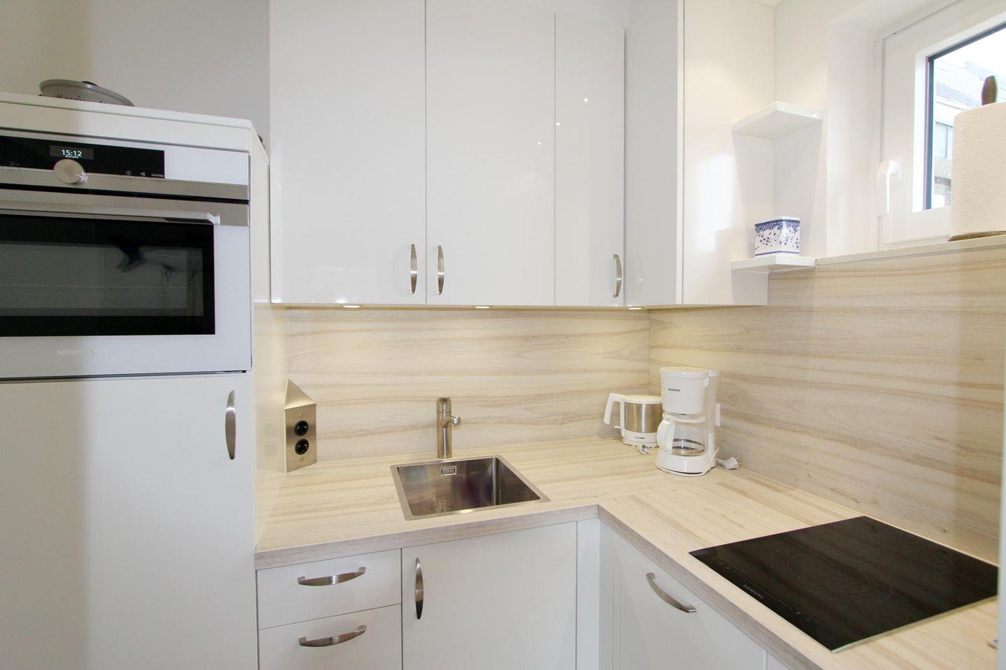 Die Küche ist hell gestaltet. Sie bietet eine umfassende Ausstattung, die es ermöglicht, die Leibspeise im Urlaub zuzubereiten. Gemütlich können Sie am Esstisch an der großen Fensterfront nach Westen speisen und genießen.