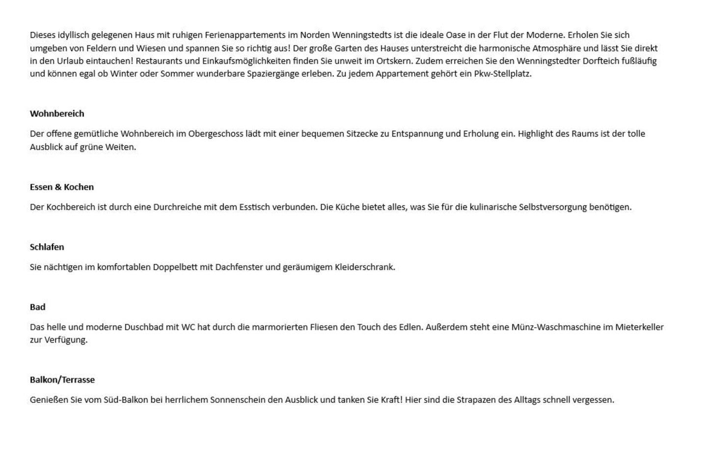 Dieses idyllisch gelegenen Haus mit ruhigen Ferienappartements im Norden Wenningstedts ist die ideale Oase in der Flut der Moderne. Erholen Sie sich umgeben von Feldern und Wiesen und spannen Sie so richtig aus! Der große Garten des Hauses unterstreicht die harmonische Atmosphäre und lässt Sie direkt in den Urlaub eintauchen! Restaurants und Einkaufsmöglichkeiten finden Sie unweit im Ortskern. Zudem erreichen Sie den Wenningstedter Dorfteich fußläufig und können egal ob Winter oder Sommer wunderbare Spaziergänge erleben. Zu jedem Appartement gehört ein Pkw-Stellplatz.