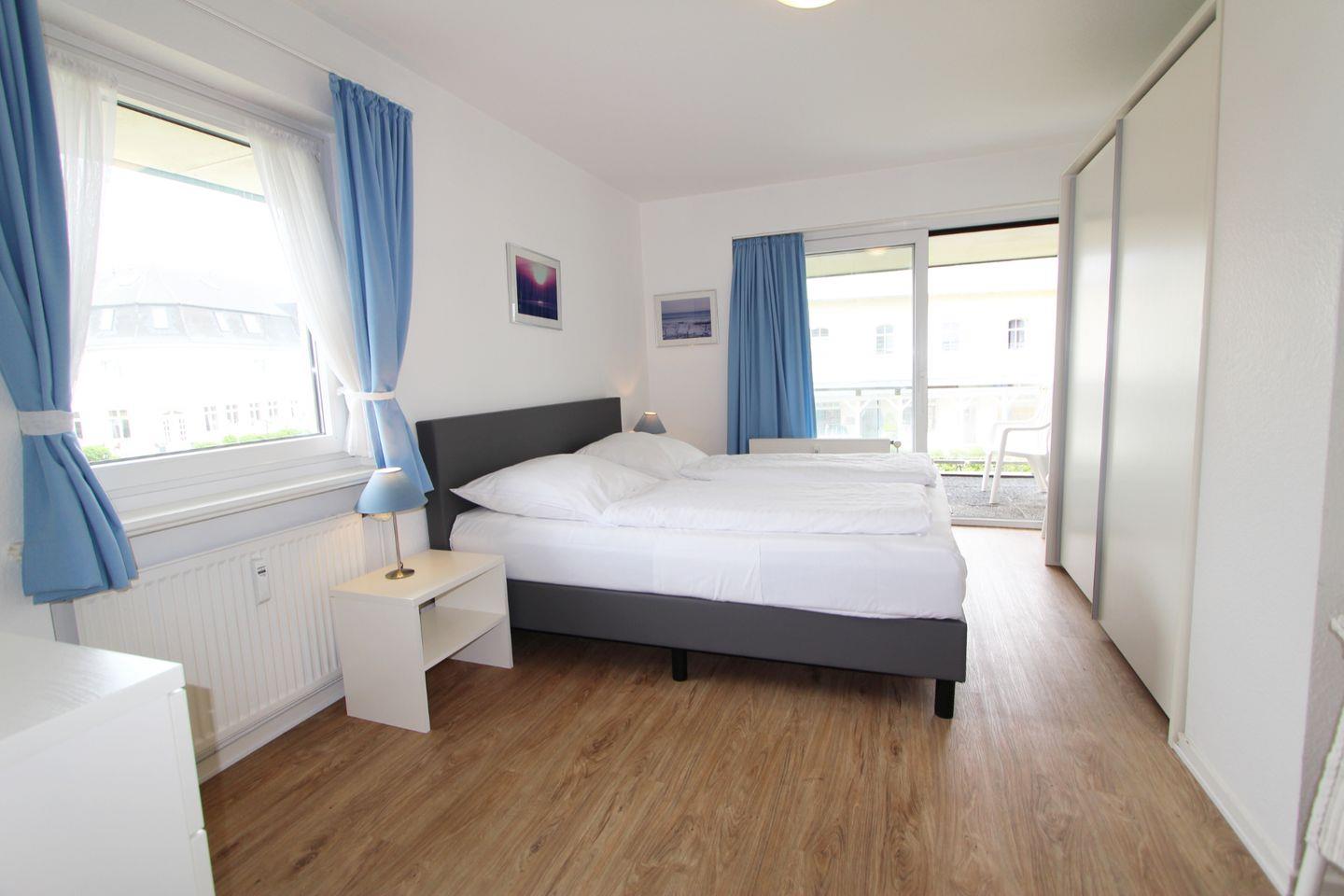 Sie schlafen in einem separaten, in friesischen Blau- und Weißtönen gehaltenen Zimmer mit Boxspringbett (durchgehender Topper) und einem eigenen Süd-Balkon, wo Sie von der Sonne begrüßt werden.