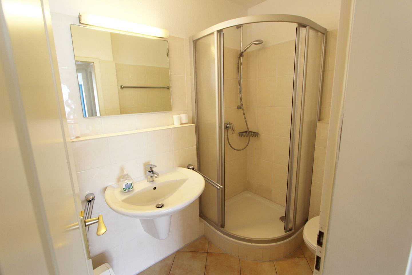 Das Badezimmer verfügt über eine Dusche und ein WC und ist in warmen Erdtönen gefliest. Außerdem stehen Ihnen eine Münz-Waschmaschine und ein Münz-Trockner im Mieterkeller zur Verfügung.