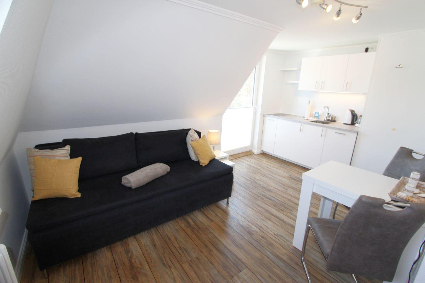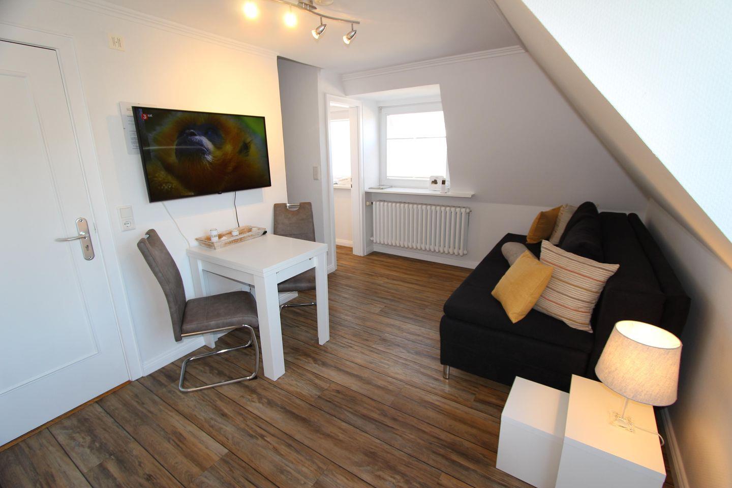 Im lichtdurchfluteten Wohnzimmer entspannen Sie auf der bequemen Couch und genießen die Ruhe. Die helle nordische Einrichtung lässt Sie vollends auf der Insel ankommen.