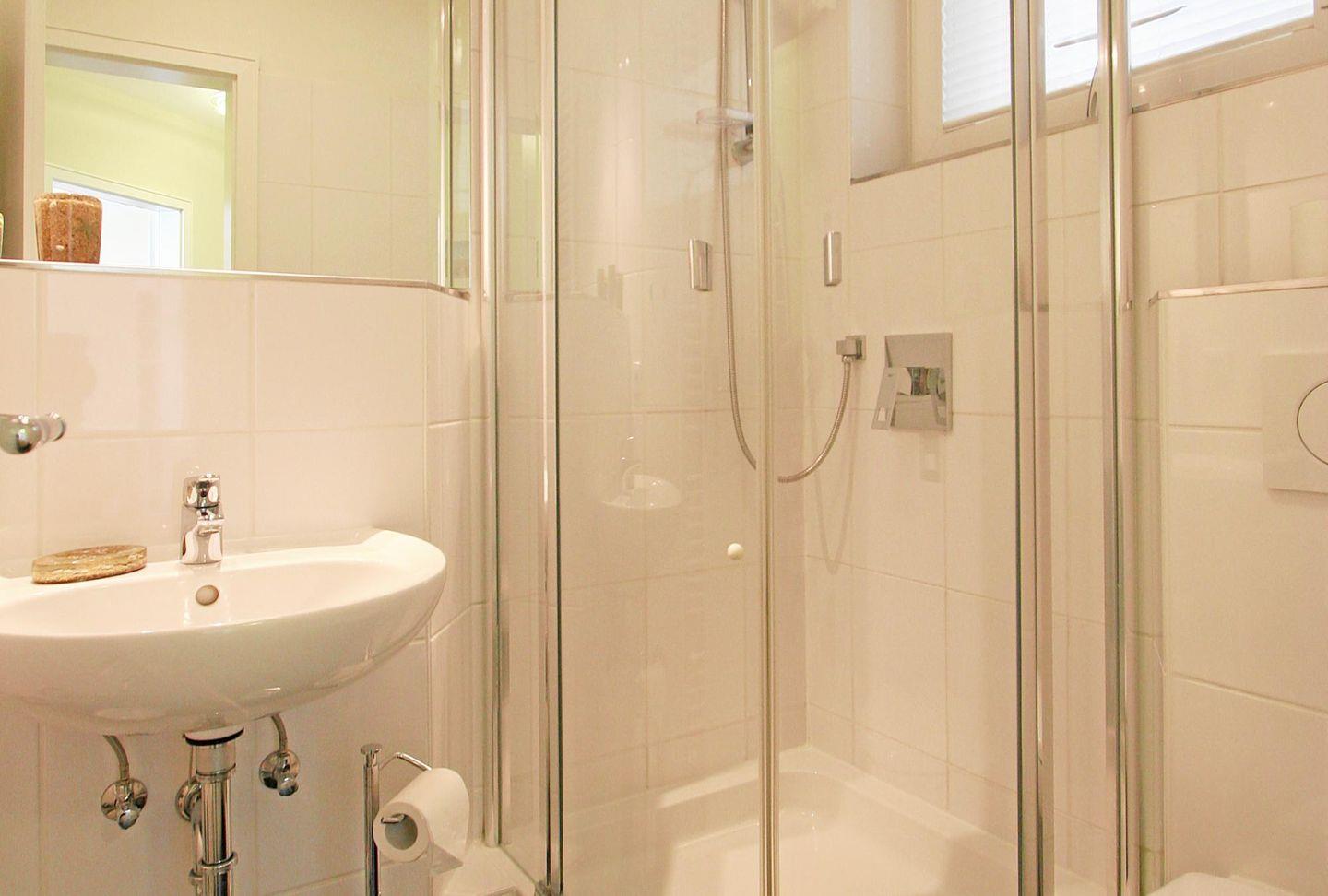 Sie genießen den Komfort eines stilvollen Badezimmers mit Glas-Duschkabine und WC. Außerdem stehen eine Münz-Waschmaschine und ein Münz-Trockner im Mieterkeller zur Verfügung.
