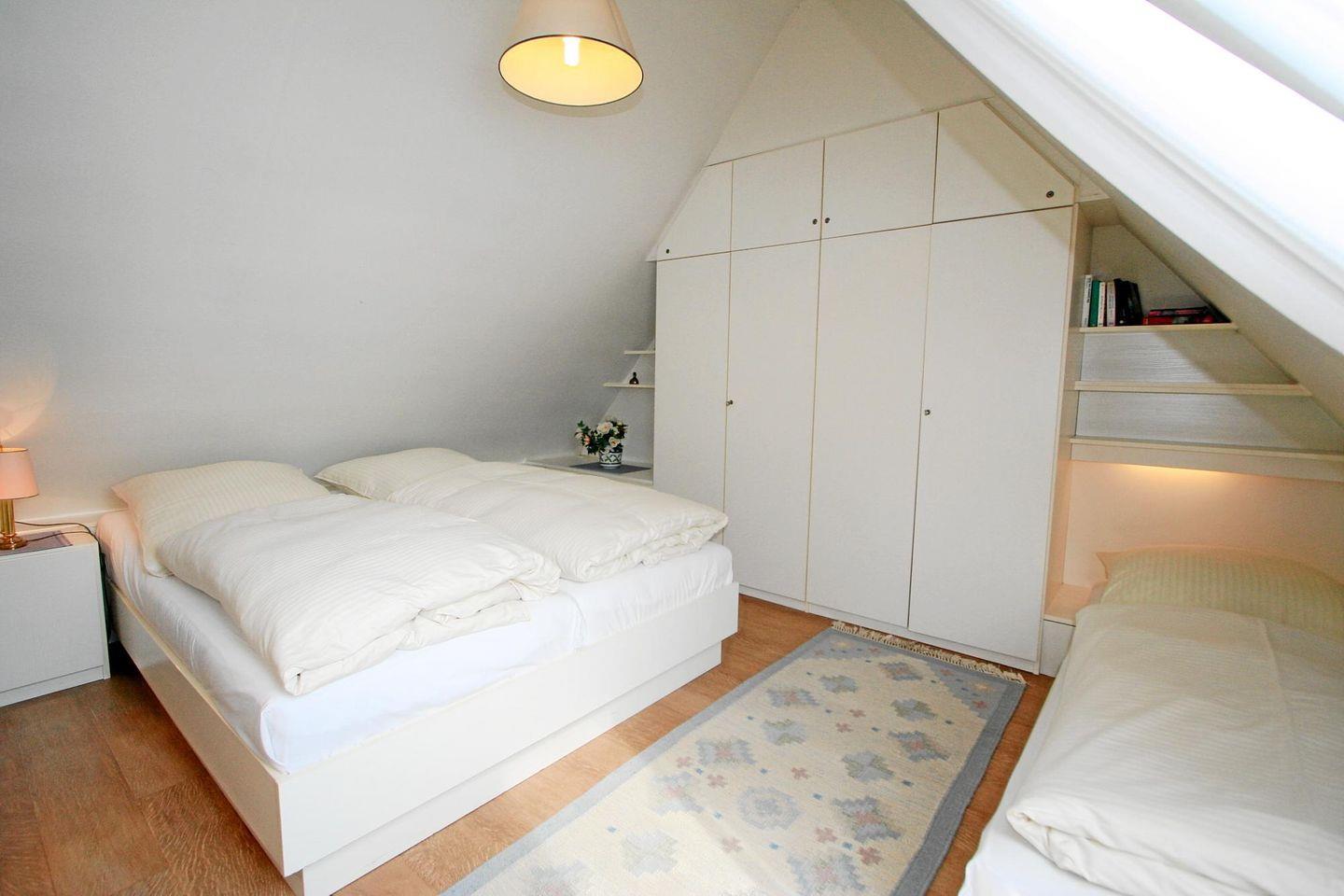 Der im Dachgeschoss gelegene Schlafraum bietet ein komfortables Doppelbett sowie ein weiteres Einzelbett. Als Ausweichmöglichkeit dient ein Schrankbett im Wohnbereich.