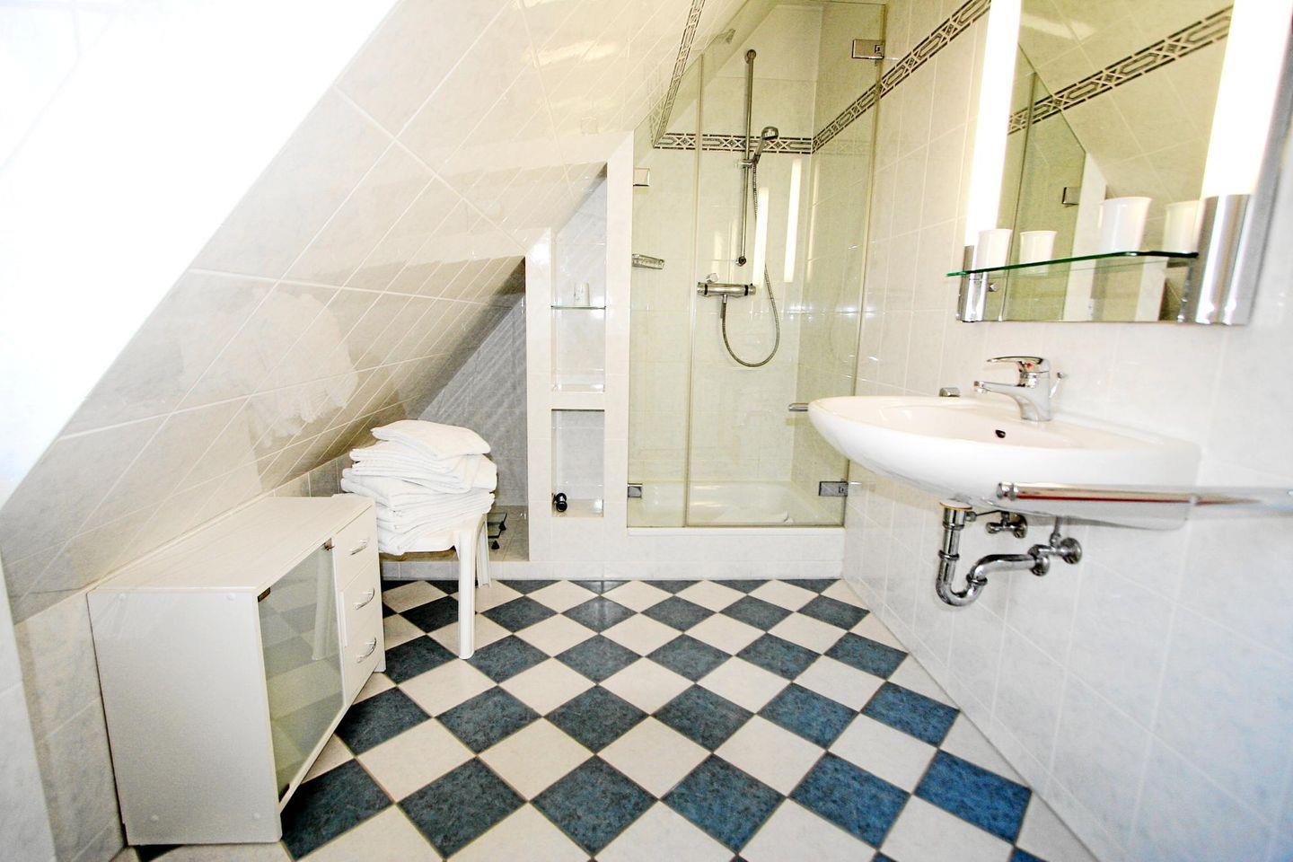 Im Badezimmer nutzen Sie Dusche und WC. Auf Grund der stilvollen Schachbrett-Musterung der Bodenfliesen genießen Sie den modernen Charme und können sich für den Urlaubstag erfrischen. Eine Waschmaschine steht als Münzgerät im Mieterkeller zur Verfügung.