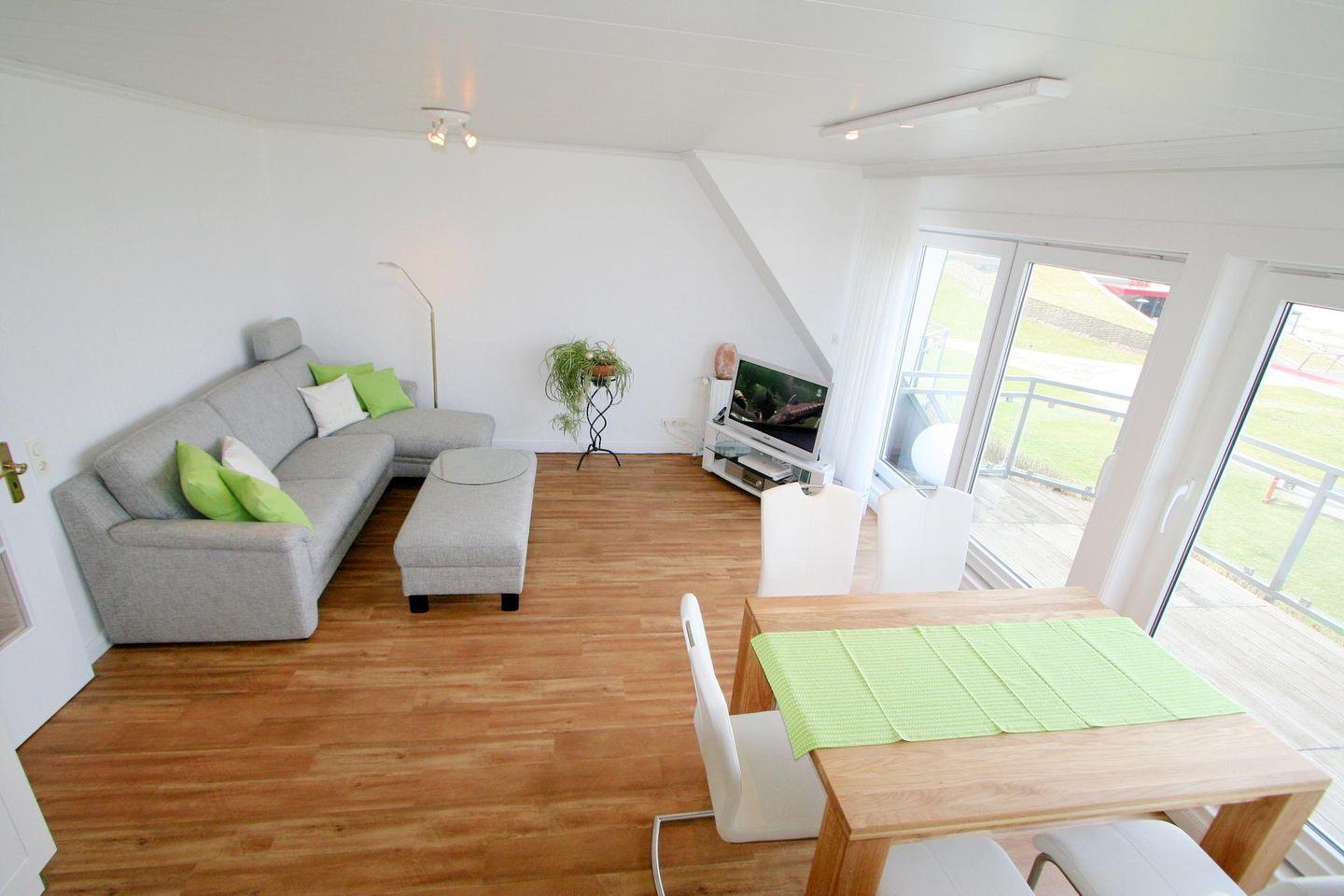 Der gemütliche Wohnbereich im Obergeschoss lädt mit einer hochwertigen, bequemen Sitzecke zu Entspannung und Erholung ein. Highlight des Wohnbereiches ist der direkte Meerblick!