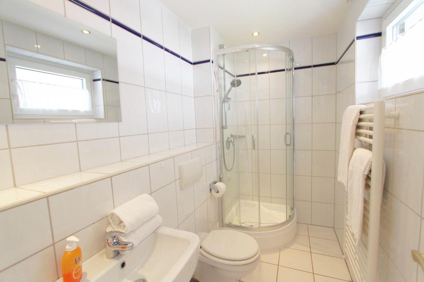 Das Badezimmer ist hell gefliest und verfügt über eine Eck-Dusche und WC. Ferner fällt durch das Fenster Tageslicht herein und man kann die frische Nordseeluft einströmen lassen. Außerdem stehen Ihnen eine Münz-Waschmaschine und ein Münz-Trockner im Mieterkeller zur Verfügung.