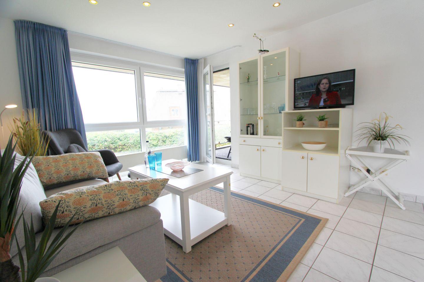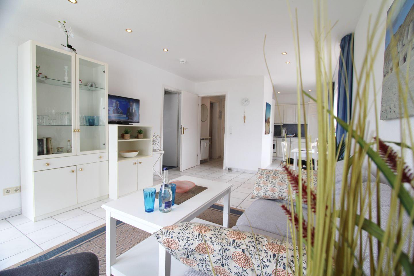 Individuell geschnittene Ferienwohnung mit zwei Zimmern auf einer Ebene im ersten Obergeschoss. Die Lage in direkter Nähe zur neu gestalteten Kurpromenade und der Blick aufs Blau des Meeres machen diese Wohnung besonders!