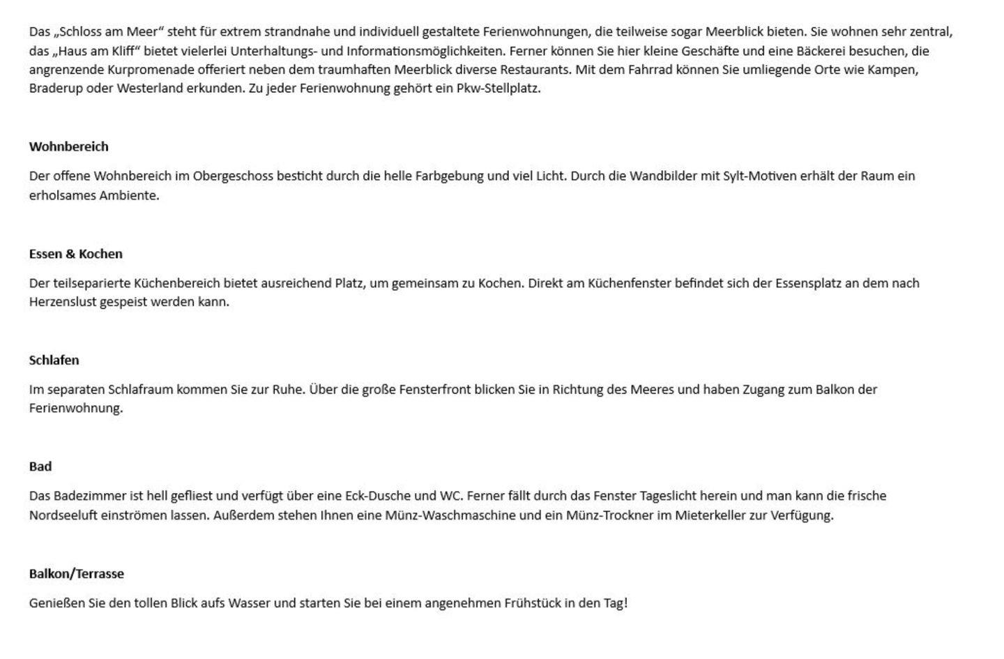 Das „Schloss am Meer“ steht für extrem strandnahe und individuell gestaltete Ferienwohnungen, die teilweise sogar Meerblick bieten. Sie wohnen sehr zentral, das „Haus am Kliff“ bietet vielerlei Unterhaltungs- und Informationsmöglichkeiten. Ferner können Sie hier kleine Geschäfte und eine Bäckerei besuchen, die angrenzende Kurpromenade offeriert neben dem traumhaften Meerblick diverse Restaurants. Mit dem Fahrrad können Sie umliegende Orte wie Kampen, Braderup oder Westerland erkunden. Zu jeder Ferienwohnung gehört ein Pkw-Stellplatz.