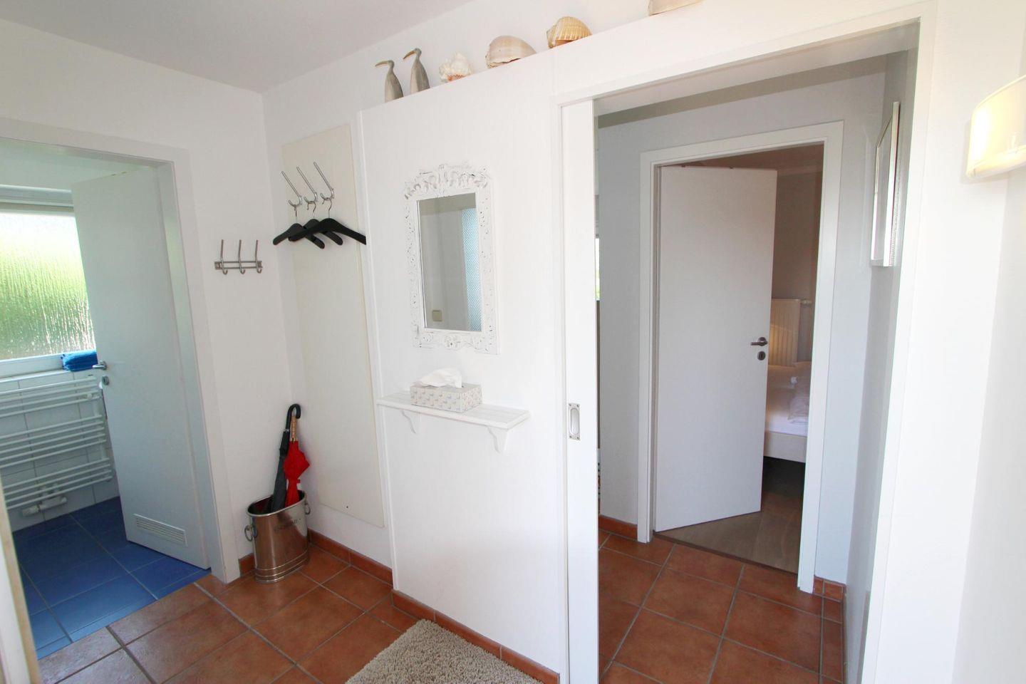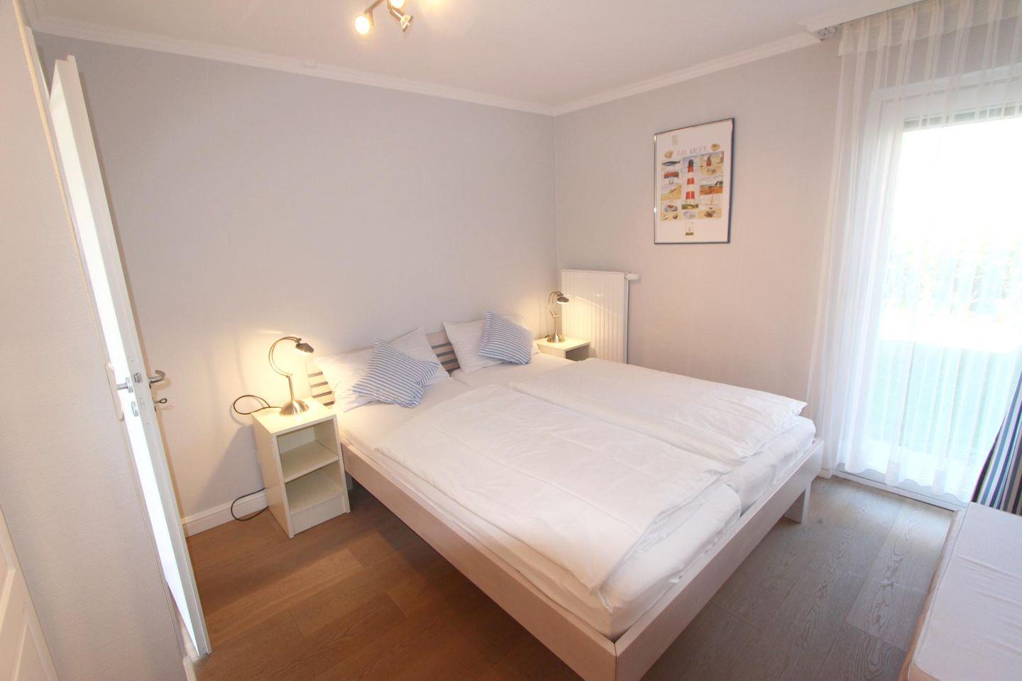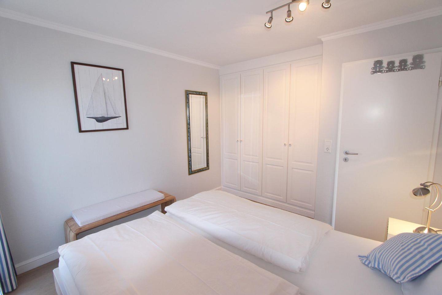 Sie verbringen Ihre Nächte im stilvoll-maritim eingerichteten Schlafzimmer mit bodentiefem Fenster zur Westseite. Der große Einbau-Kleiderschrank bietet viel Platz für Ihre Wäsche.