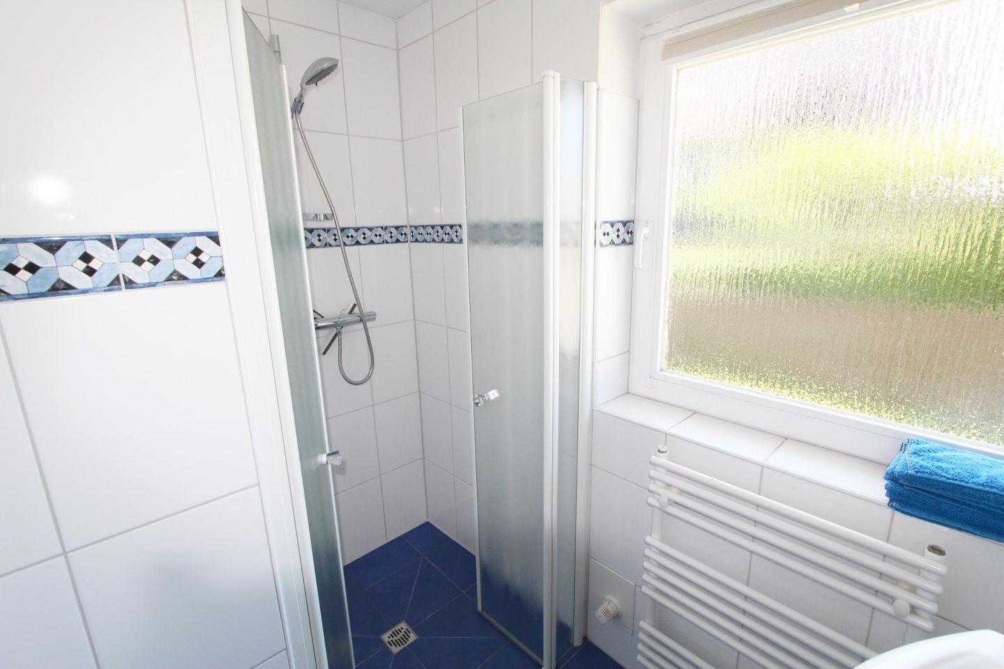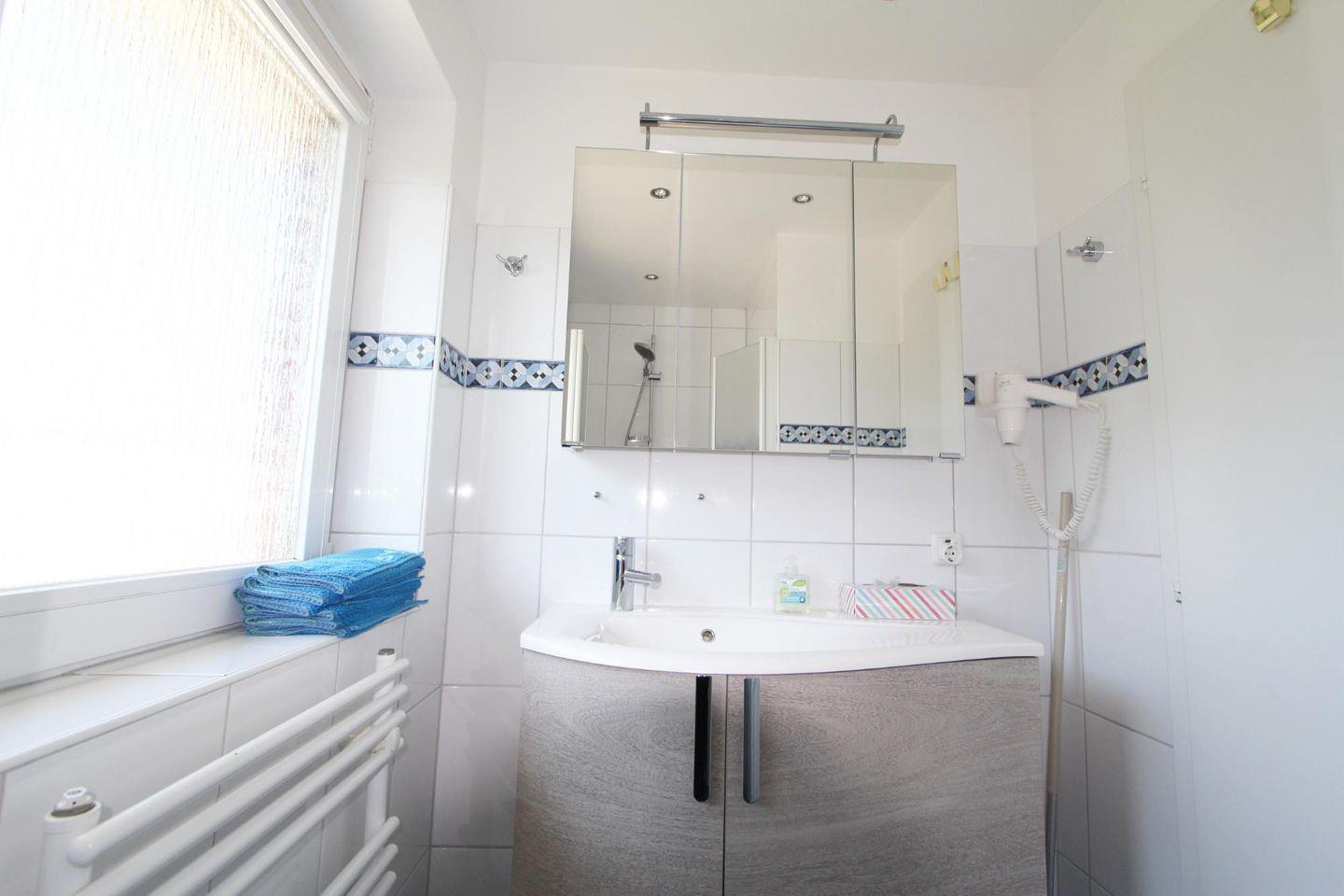 Das Badezimmer ist auf zwei separate Räume aufgeteilt, Ihnen steht ein Raum mit ebenerdiger Dusche und Waschbecken zur Verfügung, zudem befindet sich direkt daneben ein WC mit Waschbecken. Beide Räume haben Fenster zum Lüften.