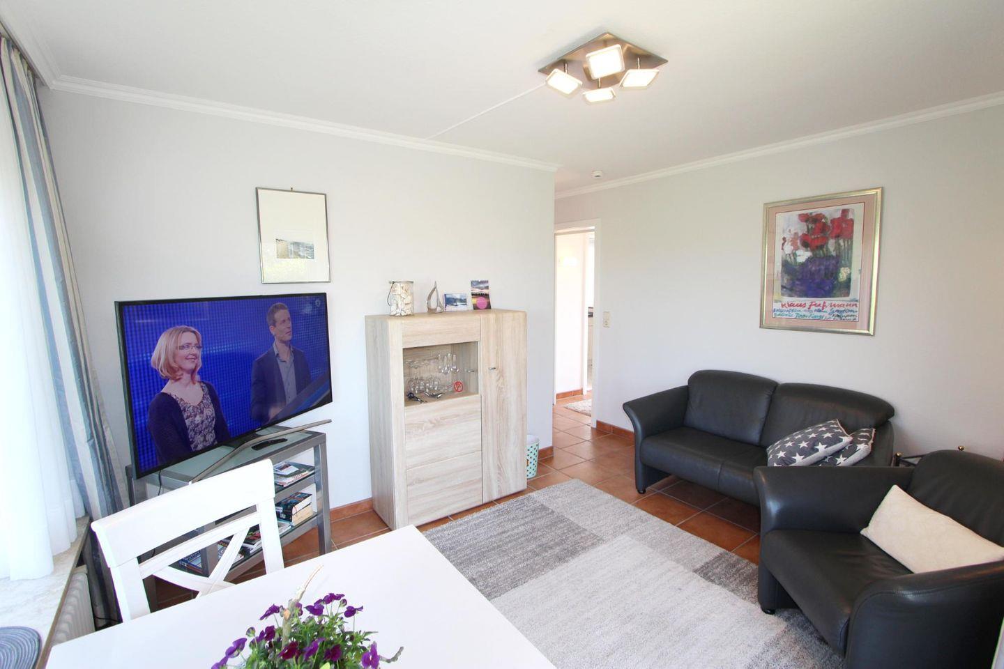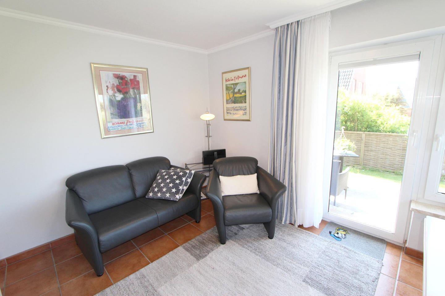 Der nach Südwesten gelegene Wohnraum im Erdgeschoss lädt zum gemütlichen Verweilen ein. Mit Blick auf die gepflegte Syltrosen-Hecke entspannen Sie hier und vergessen die Sorgen des Alltags.