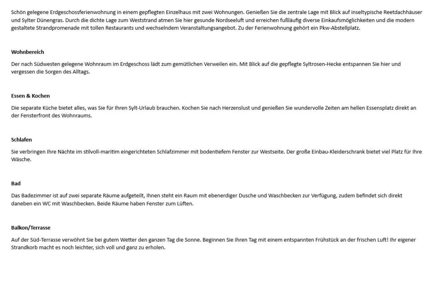 Schön gelegene Erdgeschossferienwohnung in einem gepflegten Einzelhaus mit zwei Wohnungen. Genießen Sie die zentrale Lage mit Blick auf inseltypische Reetdachhäuser und Sylter Dünengras. Durch die dichte Lage zum Weststrand atmen Sie hier gesunde Nordseeluft und erreichen fußläufig diverse Einkaufsmöglichkeiten und die modern gestaltete Strandpromenade mit tollen Restaurants und wechselndem Veranstaltungsangebot. Zu der Ferienwohnung gehört ein Pkw-Abstellplatz.