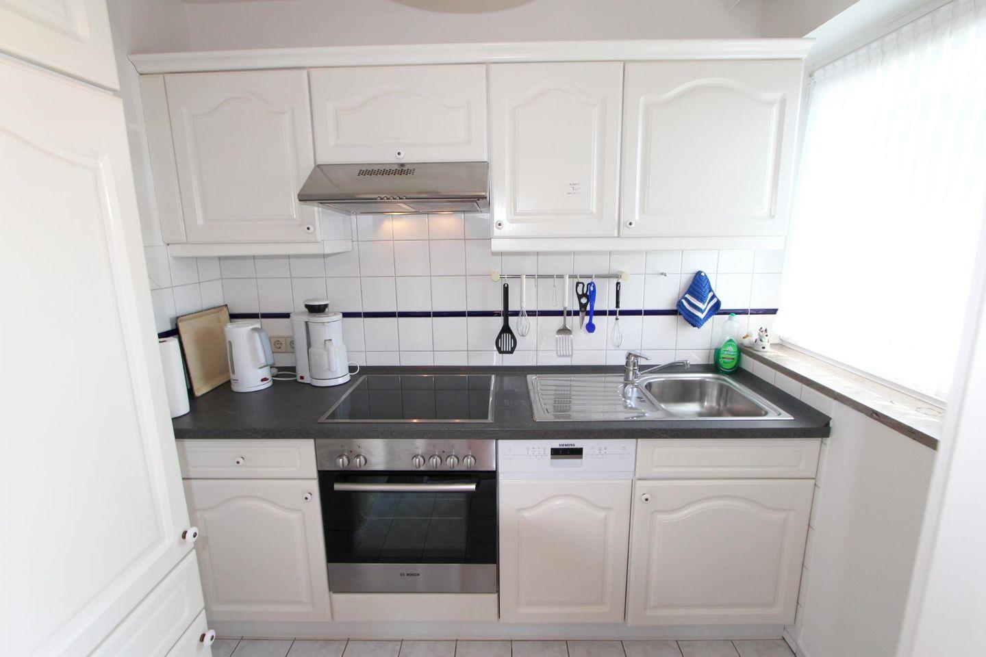 Die separate Küche bietet alles, was Sie für Ihren Sylt-Urlaub brauchen. Kochen Sie nach Herzenslust und genießen Sie wundervolle Zeiten am hellen Essensplatz direkt an der Fensterfront des Wohnraums.