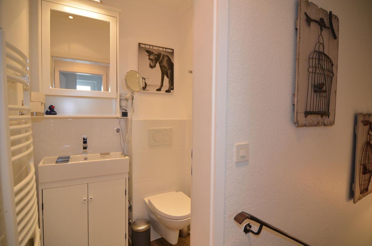 Das hell geflieste Badezimmer im Obergeschoss bietet eine große Regendusche und WC. Außerdem stehen Ihnen im Mieterkeller eine Münz-Waschmaschine und ein Münz-Trockner zur Verfügung.