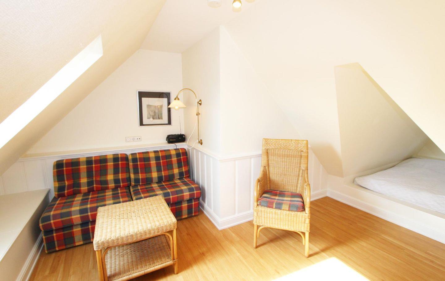 Die Ferienwohnung bietet drei separate Schlafräume. Im Obergeschoss des Hauses befinden sich zwei Doppelschlafzimmer, von denen eines mit einem Doppelbett ausgestattet ist und von dem aus Sie darüber hinaus Zugang zu einem eigenen Süd-Balkon genießen. Das andere Doppelschlafzimmer verfügt über zwei Einzelbetten. Zudem befindet sich im Dachgeschoss des Hauses ein Schlafraum mit zwei Matratzen in einer Schlafnische.