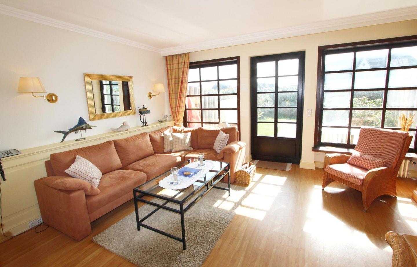 Der in warmen Farbtönen gehaltene Wohnbereich im Erdgeschoss mit der gemütlichen Sitzecke eignet sich ideal, um sich ausgiebig von den Sorgen des Alltags zu erholen.