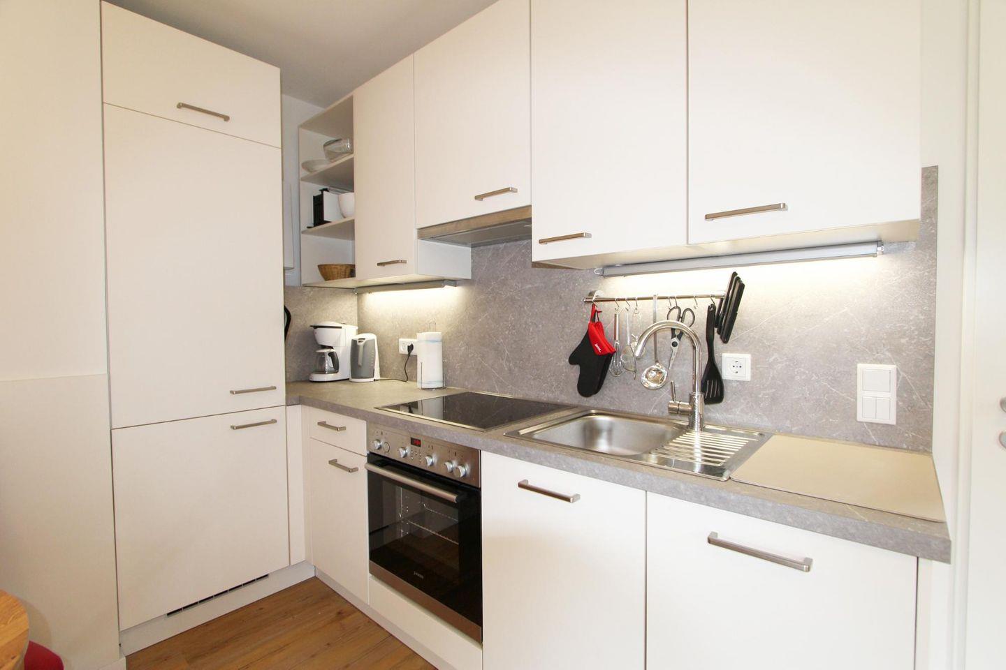 In dem modern gehaltenen Küchenbereich finden Sie ausreichend Platz zu kochen und zu speisen.