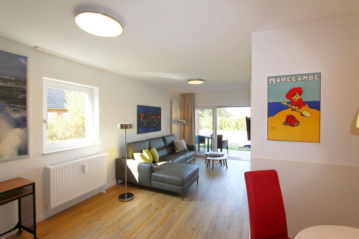 Der helle Wohnbereich im Erdgeschoss besticht durch seine elegante Einrichtung. Sie entspannen auf einer bequemen Sitzecke und blicken dabei auf den gepflegten Grünbereich im Garten. Die Wandbilder sorgen für eine angenehme und stilsichere Atmosphäre.