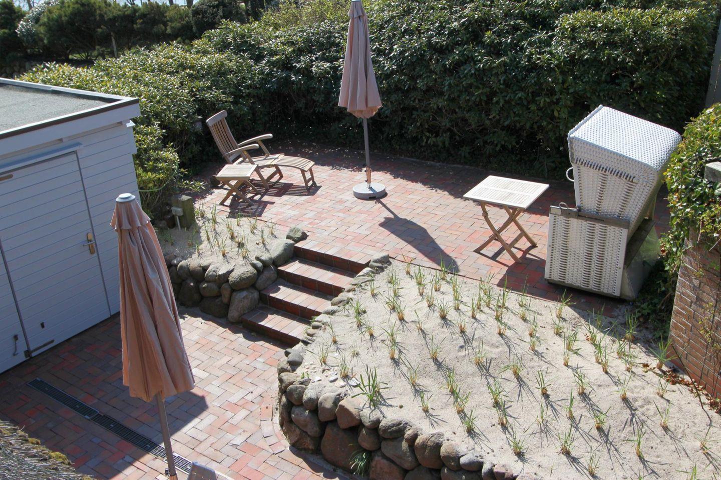 Der kleine Süd-Garten besteht aus zwei Terrassenebenen und ist komplett eingewachsen und windgeschützt.