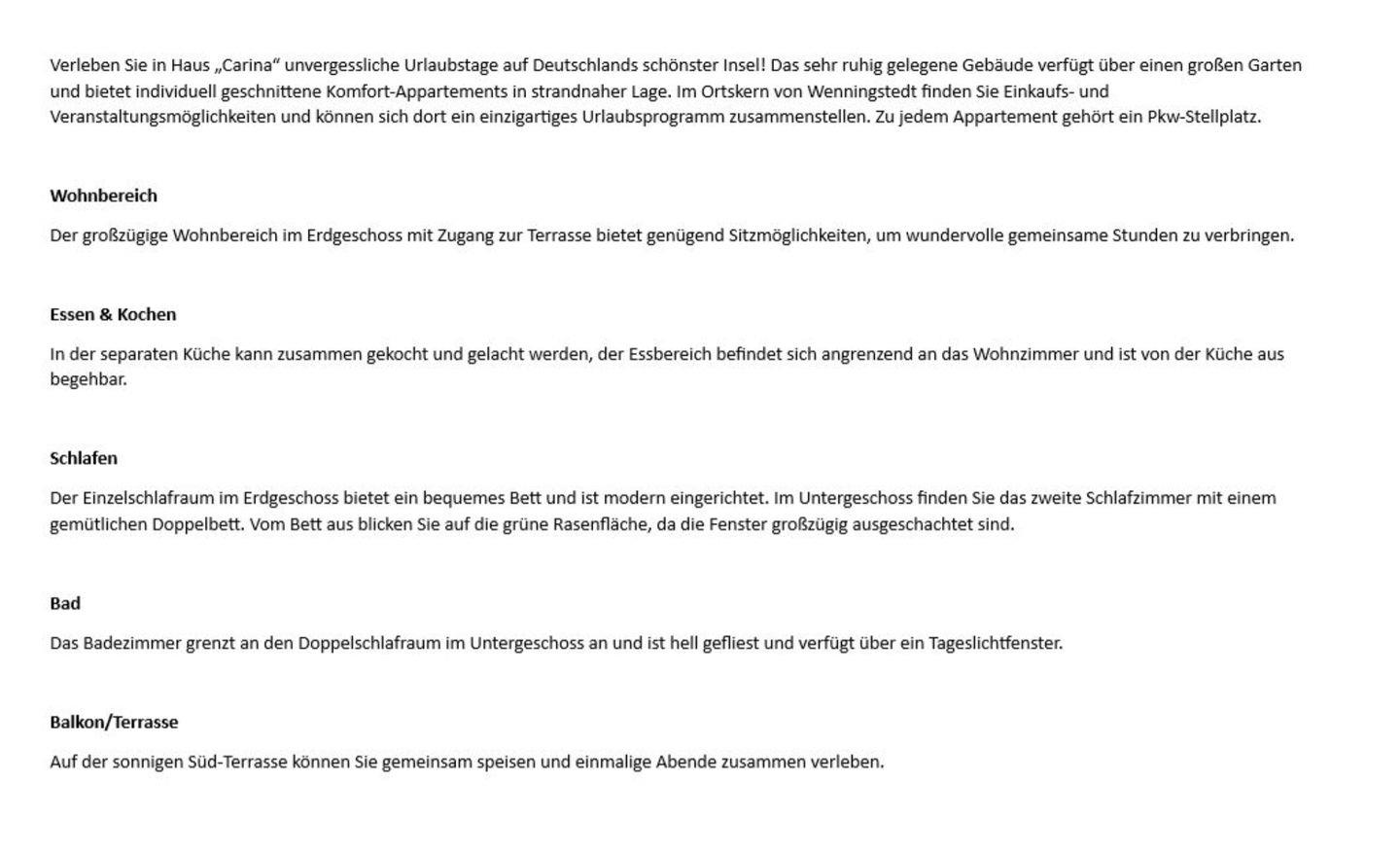 Verleben Sie in Haus „Carina“ unvergessliche Urlaubstage auf Deutschlands schönster Insel! Das sehr ruhig gelegene Gebäude verfügt über einen großen Garten und bietet individuell geschnittene Komfort-Appartements in strandnaher Lage. Im Ortskern von Wenningstedt finden Sie Einkaufs- und Veranstaltungsmöglichkeiten und können sich dort ein einzigartiges Urlaubsprogramm zusammenstellen. Zu jedem Appartement gehört ein Pkw-Stellplatz.