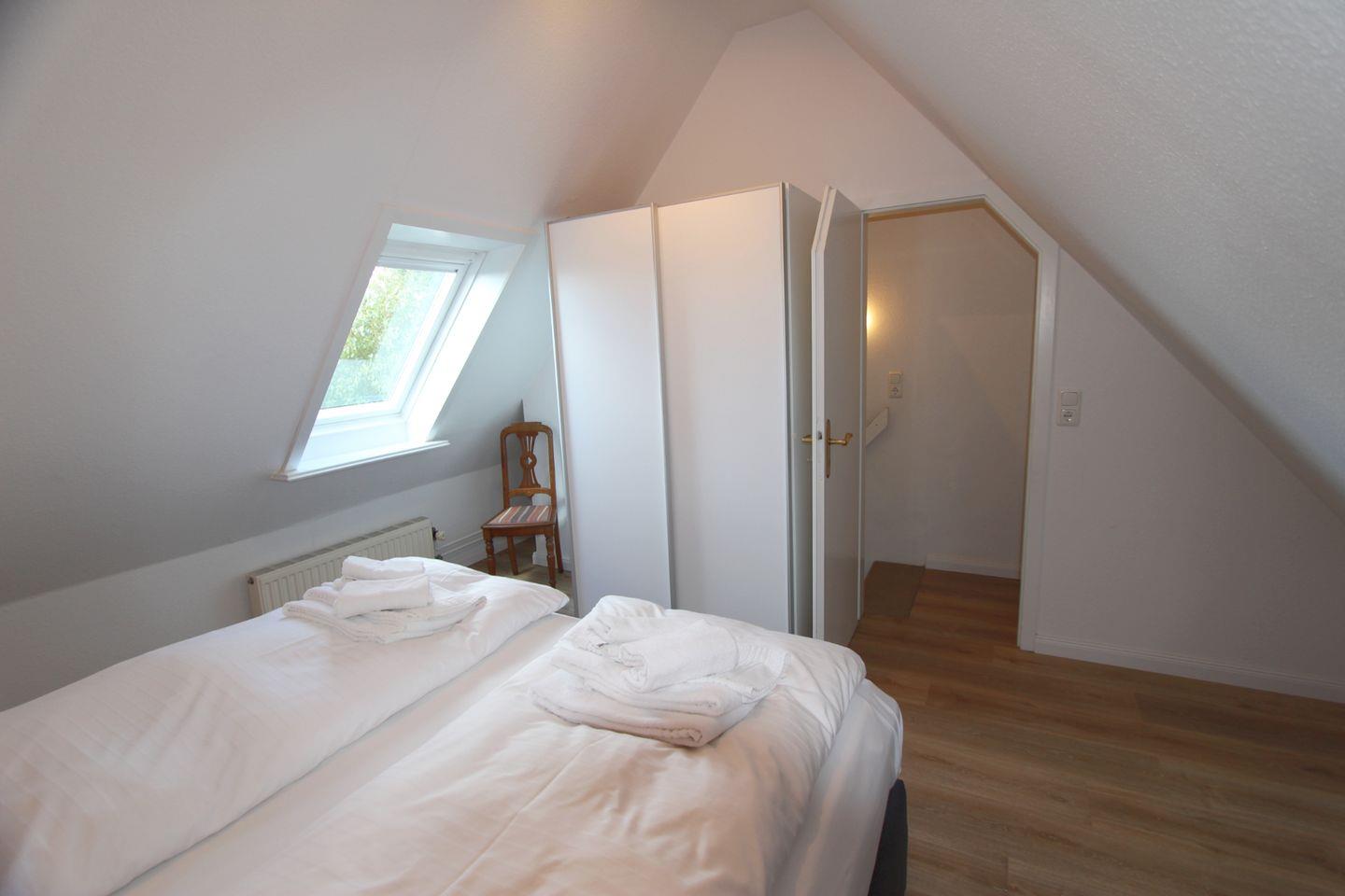 Im Schlafbereich im Dachgeschoss können Sie ruhig träumen. Das komfortable Boxspringbett und der geräumige Kleiderschrank befinden sich hier. Von hier aus können Sie das Meer sehen! Im Wohnzimmer steht zudem eine Schlafcouch zur Verfügung.