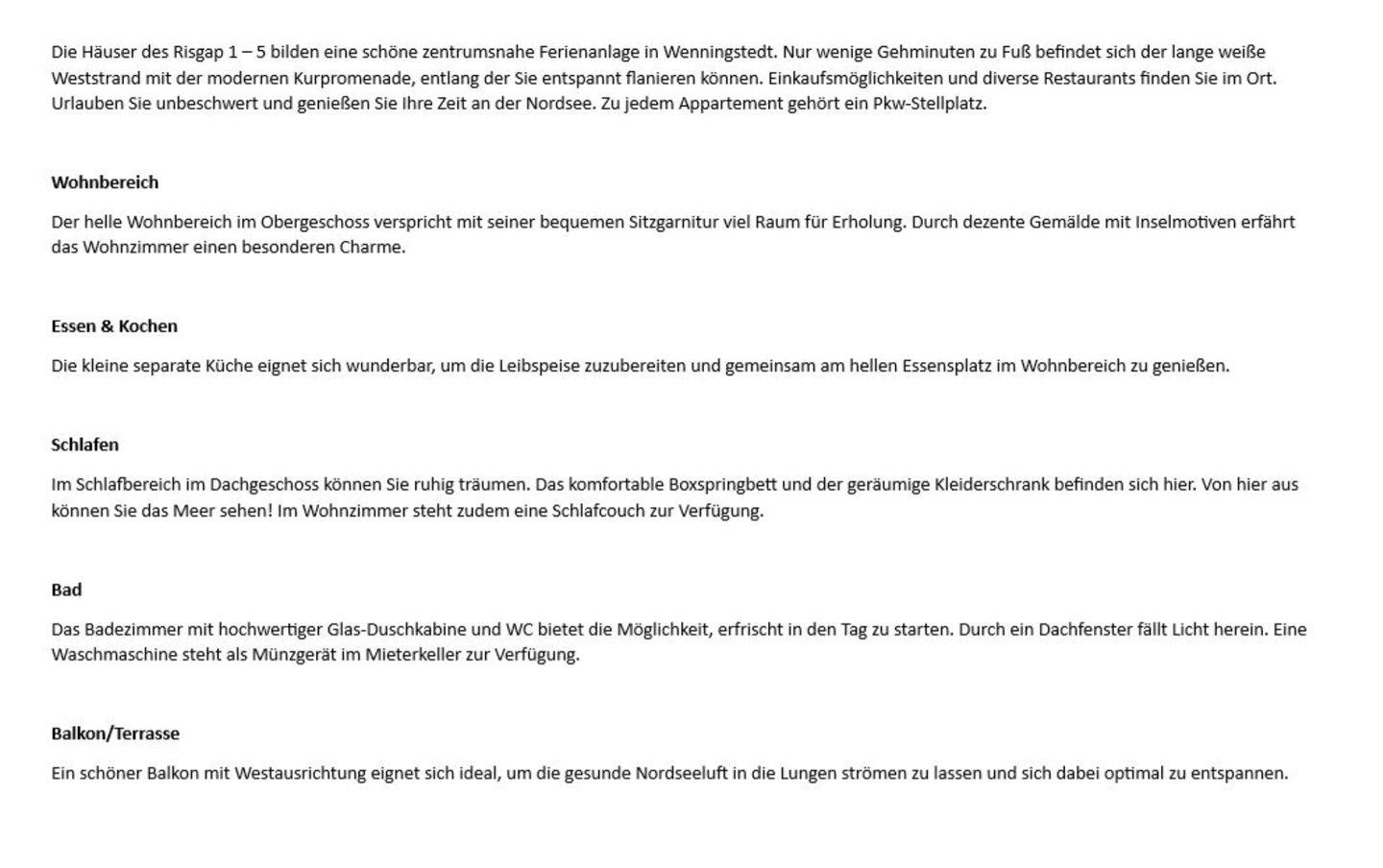 Die Häuser des Risgap 1 – 5 bilden eine schöne zentrumsnahe Ferienanlage in Wenningstedt. Nur wenige Gehminuten zu Fuß befindet sich der lange weiße Weststrand mit der modernen Kurpromenade, entlang der Sie entspannt flanieren können. Einkaufsmöglichkeiten und diverse Restaurants finden Sie im Ort. Urlauben Sie unbeschwert und genießen Sie Ihre Zeit an der Nordsee. Zu jedem Appartement gehört ein Pkw-Stellplatz.