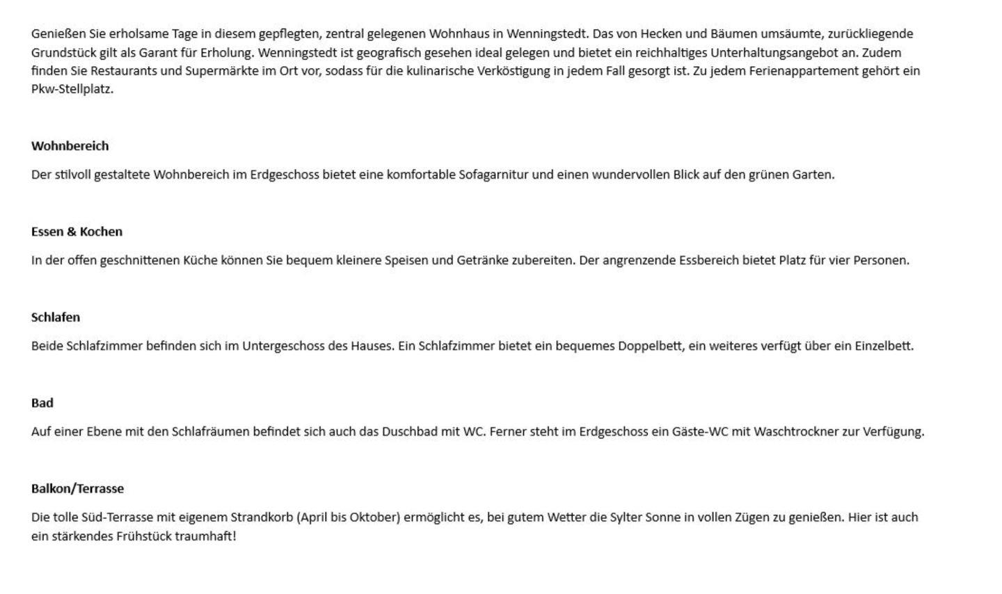Genießen Sie erholsame Tage in diesem gepflegten, zentral gelegenen Wohnhaus in Wenningstedt. Das von Hecken und Bäumen umsäumte, zurückliegende Grundstück gilt als Garant für Erholung. Wenningstedt ist geografisch gesehen ideal gelegen und bietet ein reichhaltiges Unterhaltungsangebot an. Zudem finden Sie Restaurants und Supermärkte im Ort vor, sodass für die kulinarische Verköstigung in jedem Fall gesorgt ist. Zu jedem Ferienappartement gehört ein Pkw-Stellplatz.