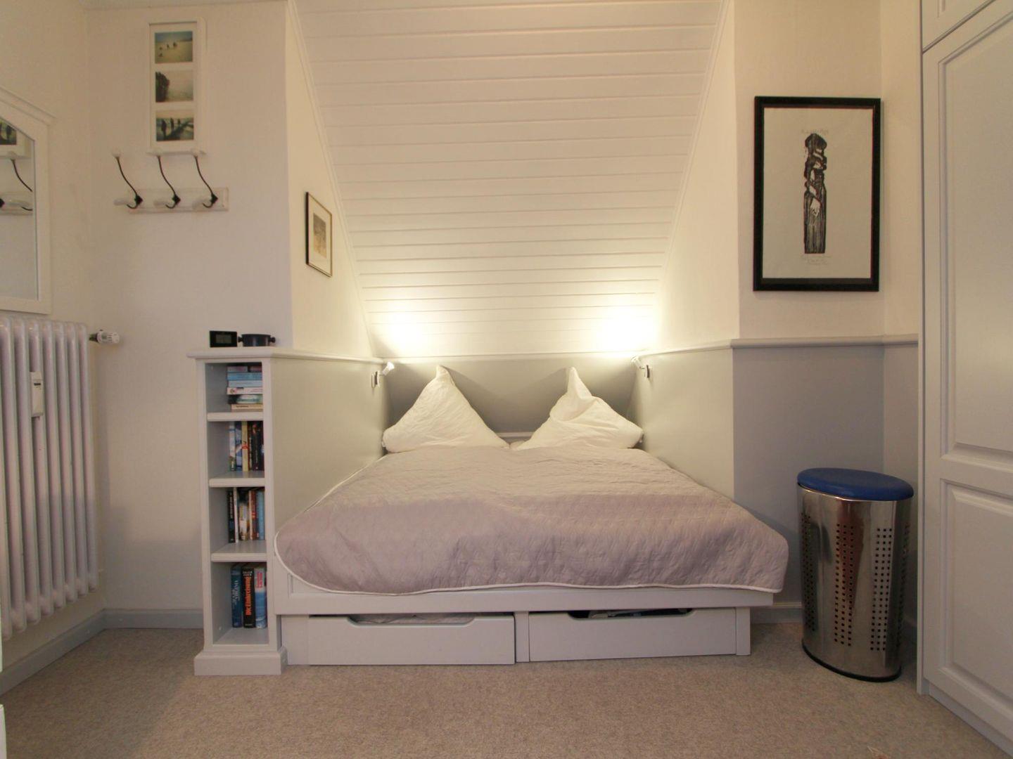 Im Dachgeschoss befindet sich der Schlafraum mit dem komfortablen Doppelbett in einer heimeligen Schlafnische. Der Kleiderschrank bietet ausreichend Platz, um das Reisegepäck zu verstauen. Genießen Sie hier ruhige Träume!