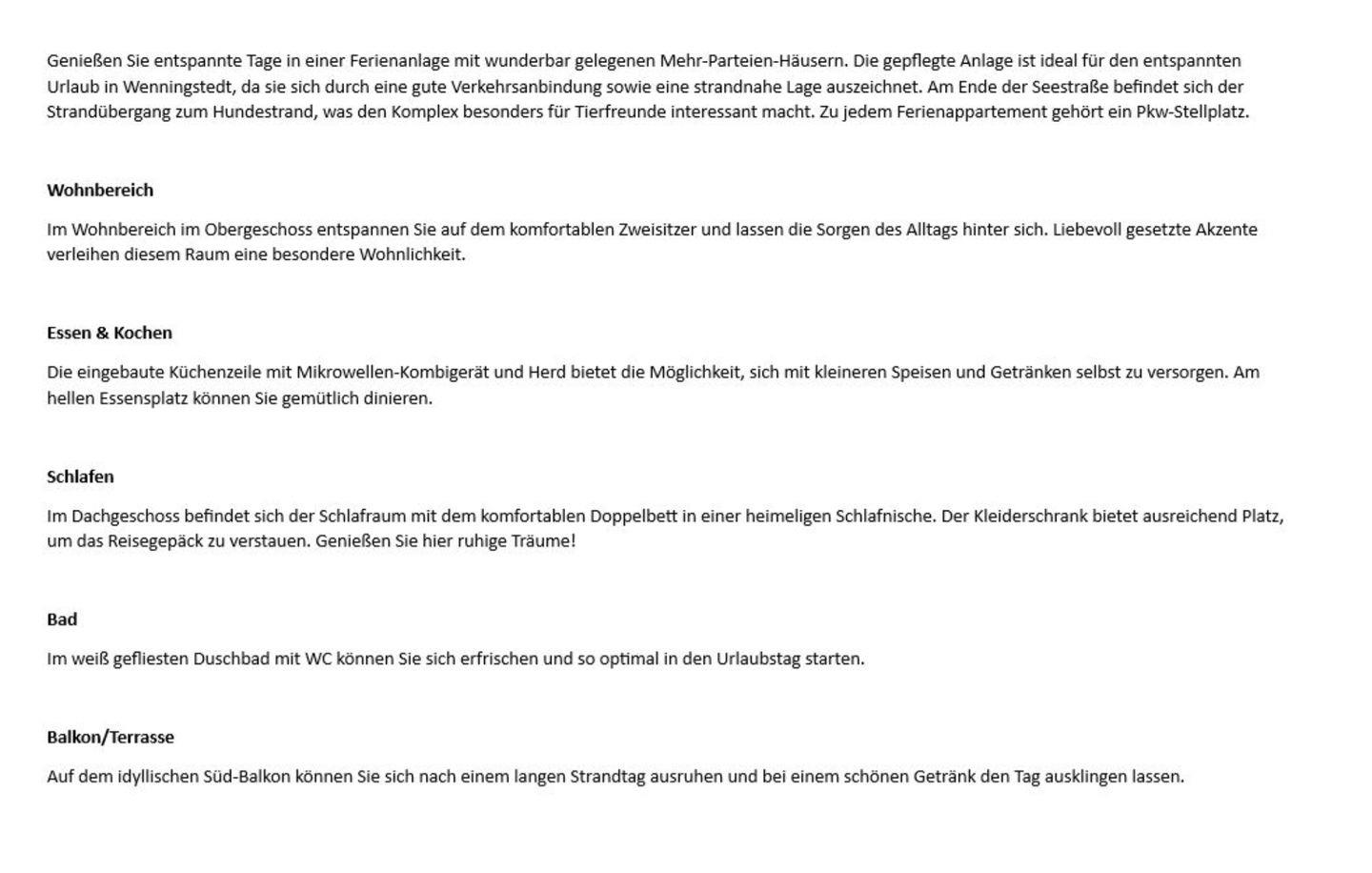 Genießen Sie entspannte Tage in einer Ferienanlage mit wunderbar gelegenen Mehr-Parteien-Häusern. Die gepflegte Anlage ist ideal für den entspannten Urlaub in Wenningstedt, da sie sich durch eine gute Verkehrsanbindung sowie eine strandnahe Lage auszeichnet. Am Ende der Seestraße befindet sich der Strandübergang zum Hundestrand, was den Komplex besonders für Tierfreunde interessant macht. Zu jedem Ferienappartement gehört ein Pkw-Stellplatz.