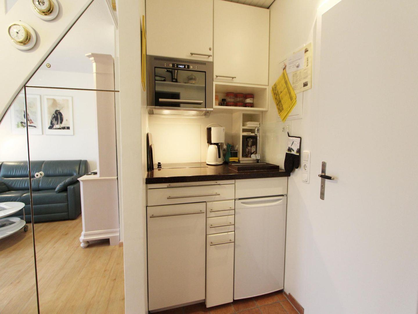 Die eingebaute Küchenzeile mit Mikrowellen-Kombigerät und Herd bietet die Möglichkeit, sich mit kleineren Speisen und Getränken selbst zu versorgen. Am hellen Essensplatz können Sie gemütlich dinieren.