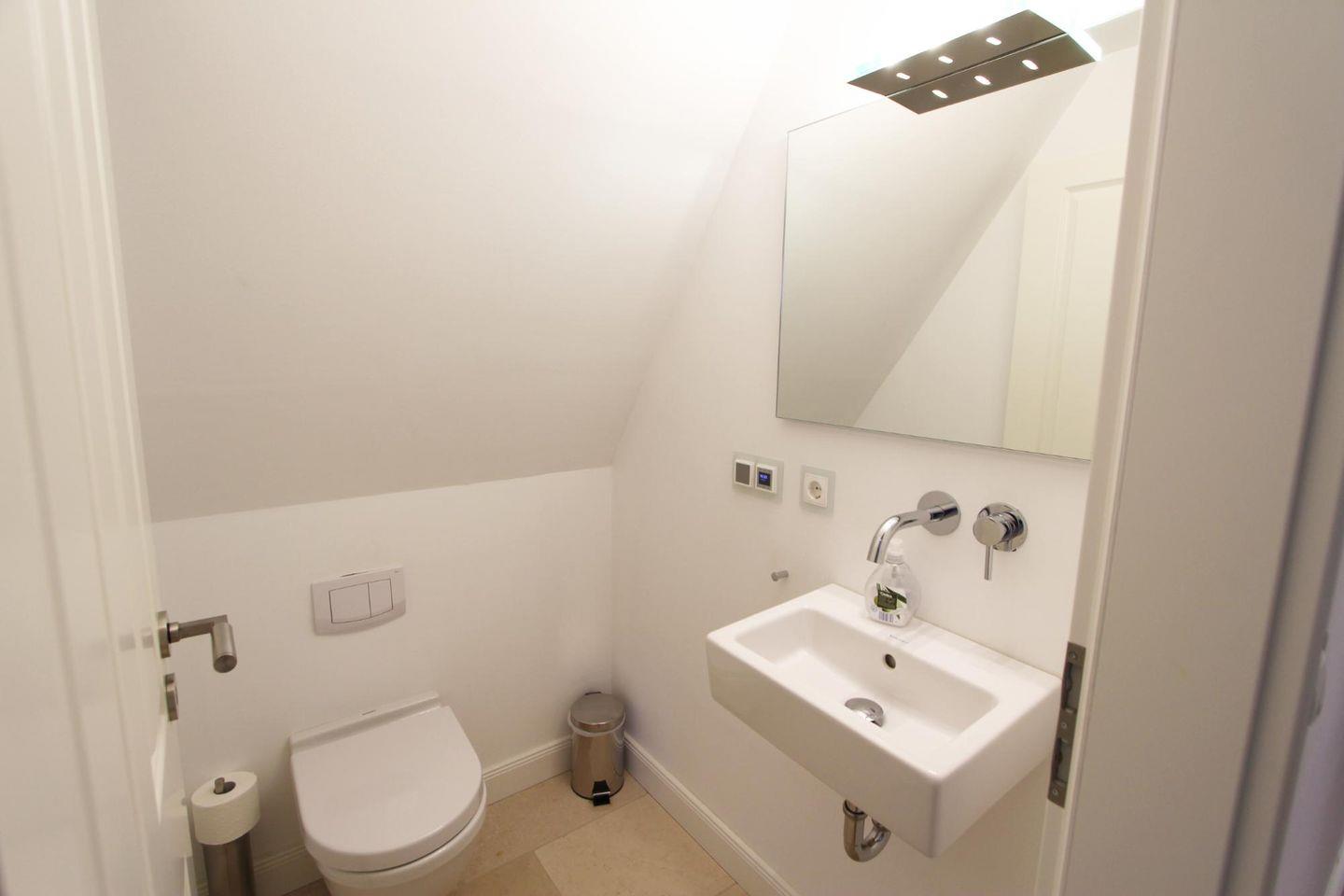 Das Haus verfügt über ein Duschbad mit WC im Erdgeschoss und ein Badzimmer mit WC, Dusche und Wanne im Obergeschoss. Ferner nutzen Sie auf der Schlafebene noch ein Gäste-WC. Alle Bäder sind mit hochwertigem Limestone-Naturstein gefliest.
